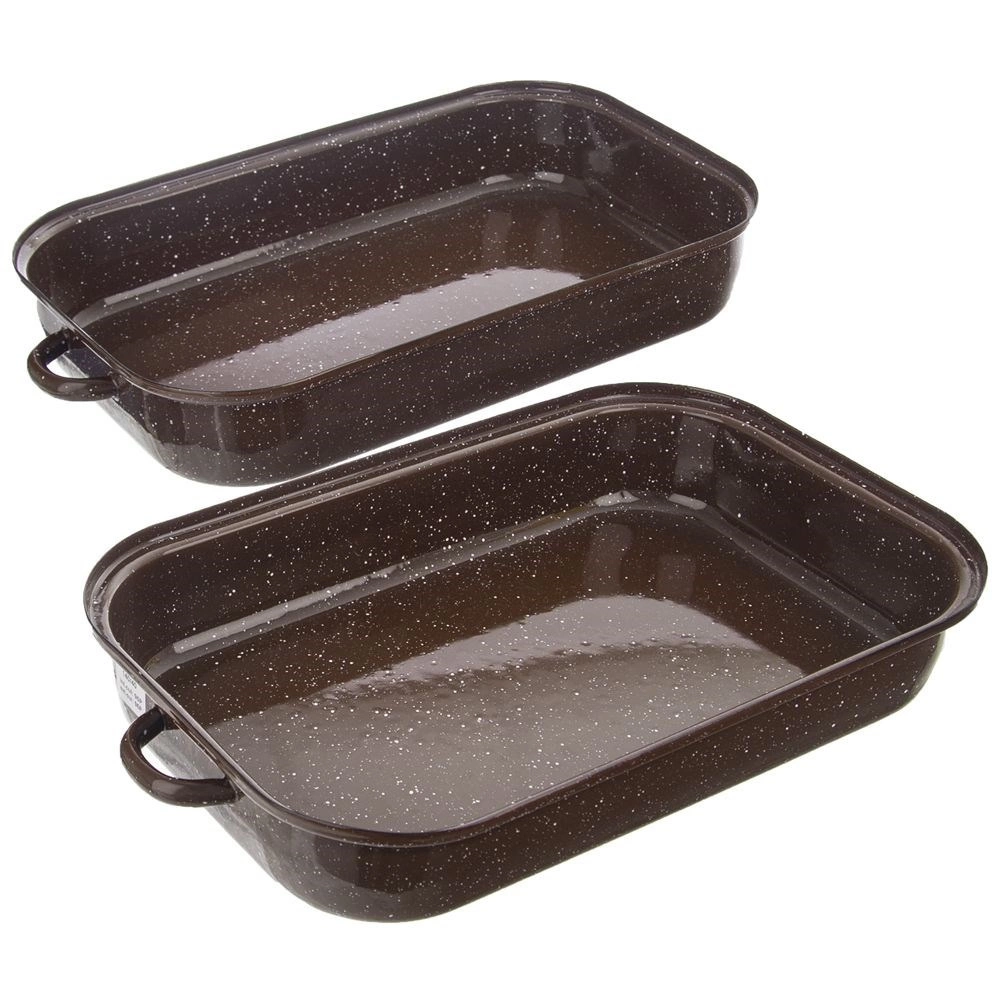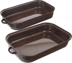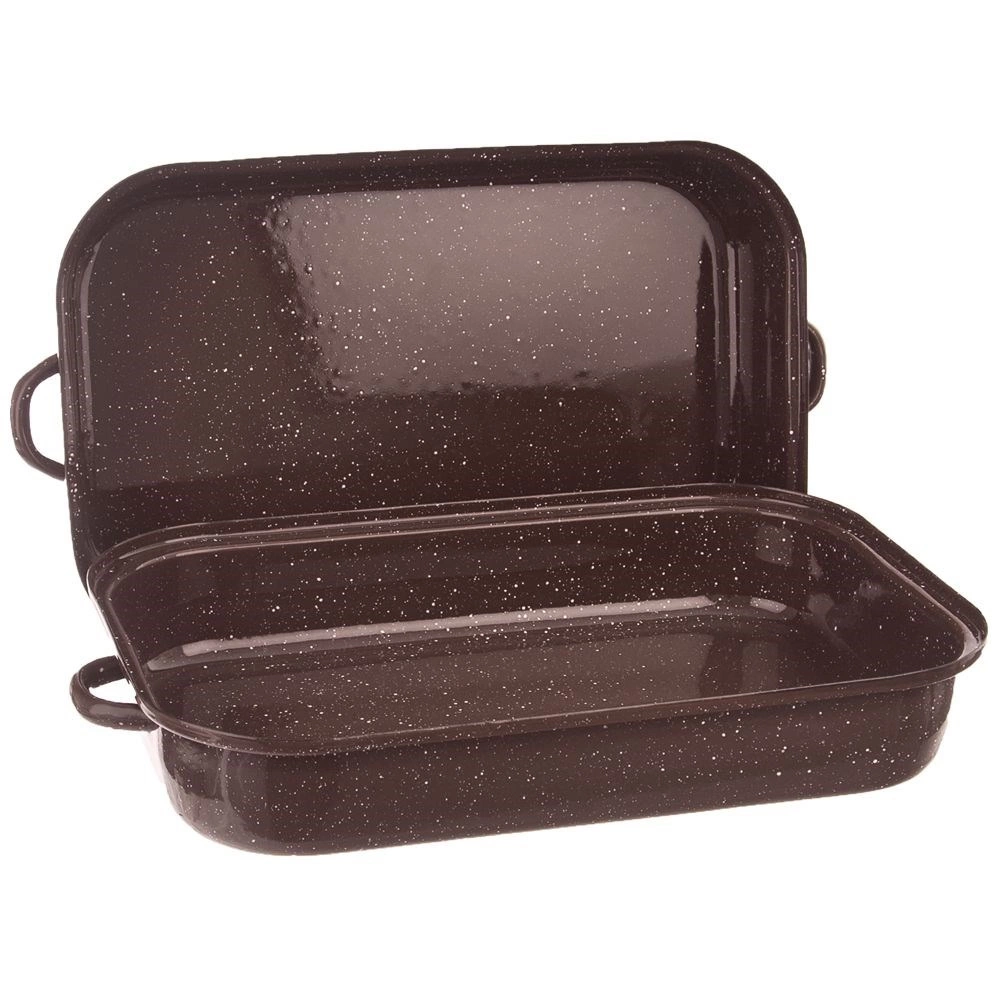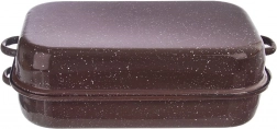 Nagy űrtartalmú, zománcozott sütőtál fedővel, 46 × 27,5 × 14,5 cm méretben, amely akár 2 önálló edényt kínál sütéshez és tálaláshoz. Tartós zománcozott acél barna színben, minden tűzhelytípussal kompatibilis, beleértve az indukciót is, tapadáscsökkentő tulajdonsággal az egyszerű tisztításért és mosogatógépben mosható. Eredeti ORION termék.