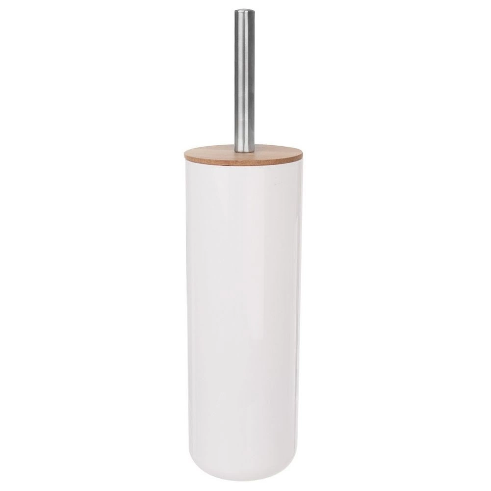 A minimalista fehér tartó természetes bambusz fedéllel elegánsan rejti a kefét, és vizuálisan rendezetté teszi fürdőszobáját.