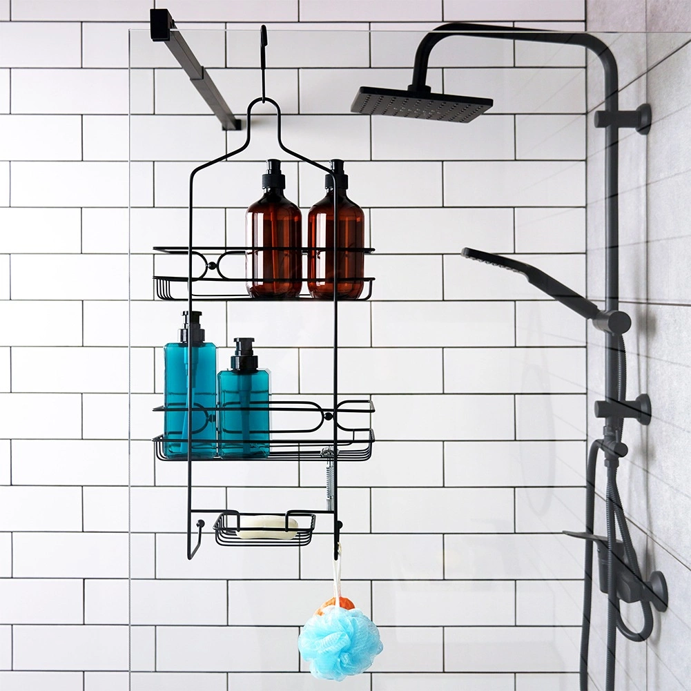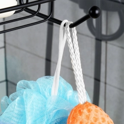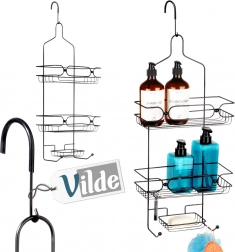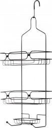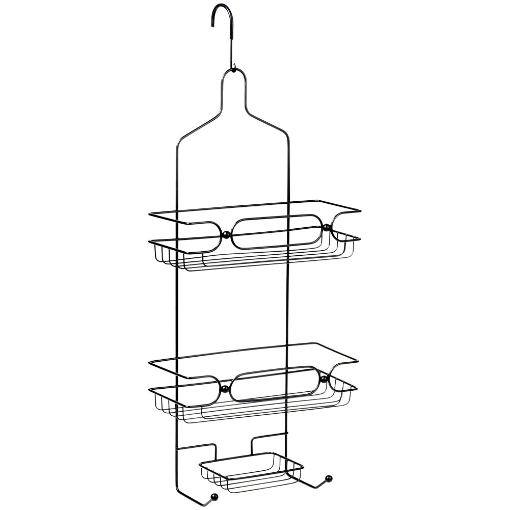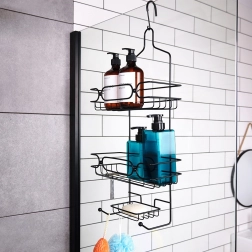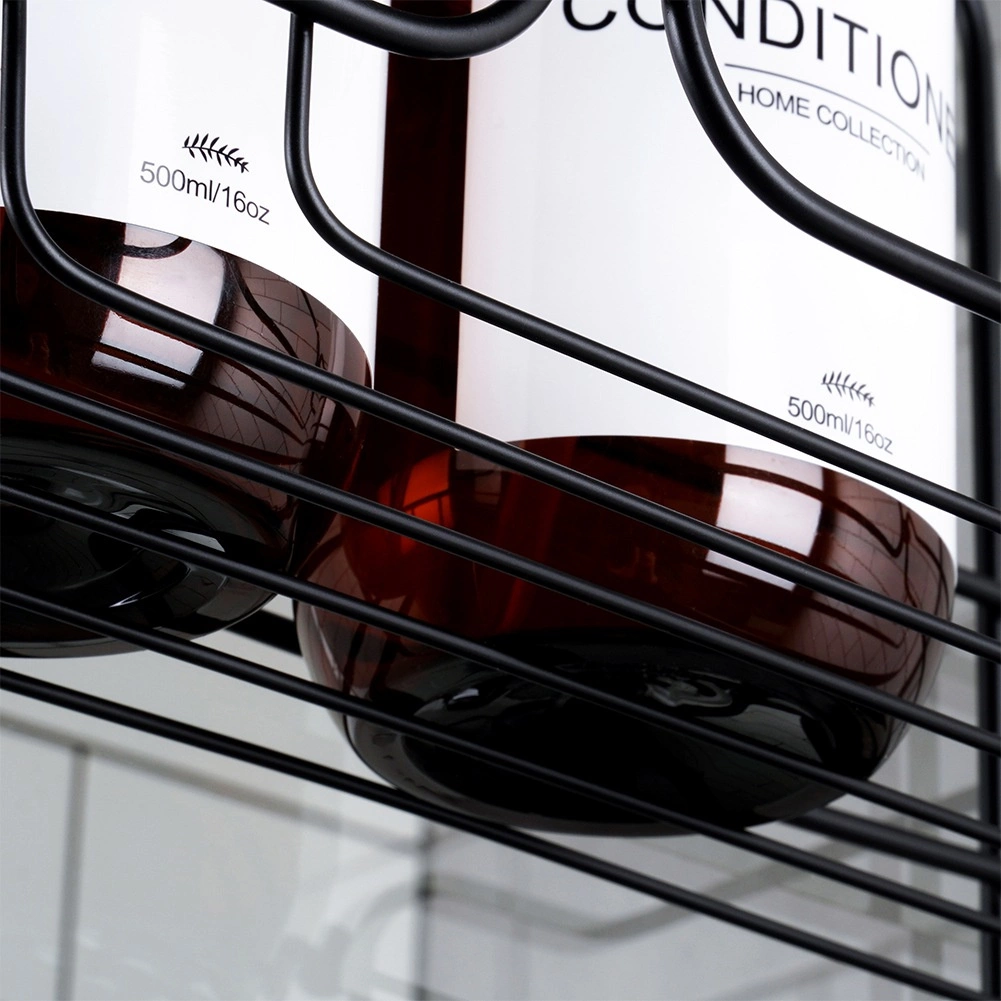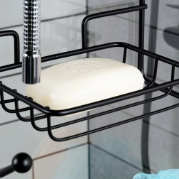 A minőségi, fekete festésű fém erős és korrózióálló, így a polc megbízhatóan bírja a mindennapos használatot. A függesztő akasztó gumiborítása védi az üveget és megakadályozza az elcsúszást. A két nagy polc elfértet samponokat és géleket, az alsó szappantartó és a két akasztó ideális szivacsokhoz, borotvákhoz vagy kefékhez.