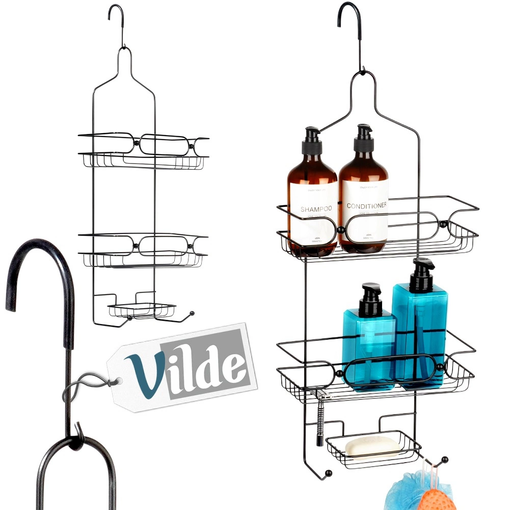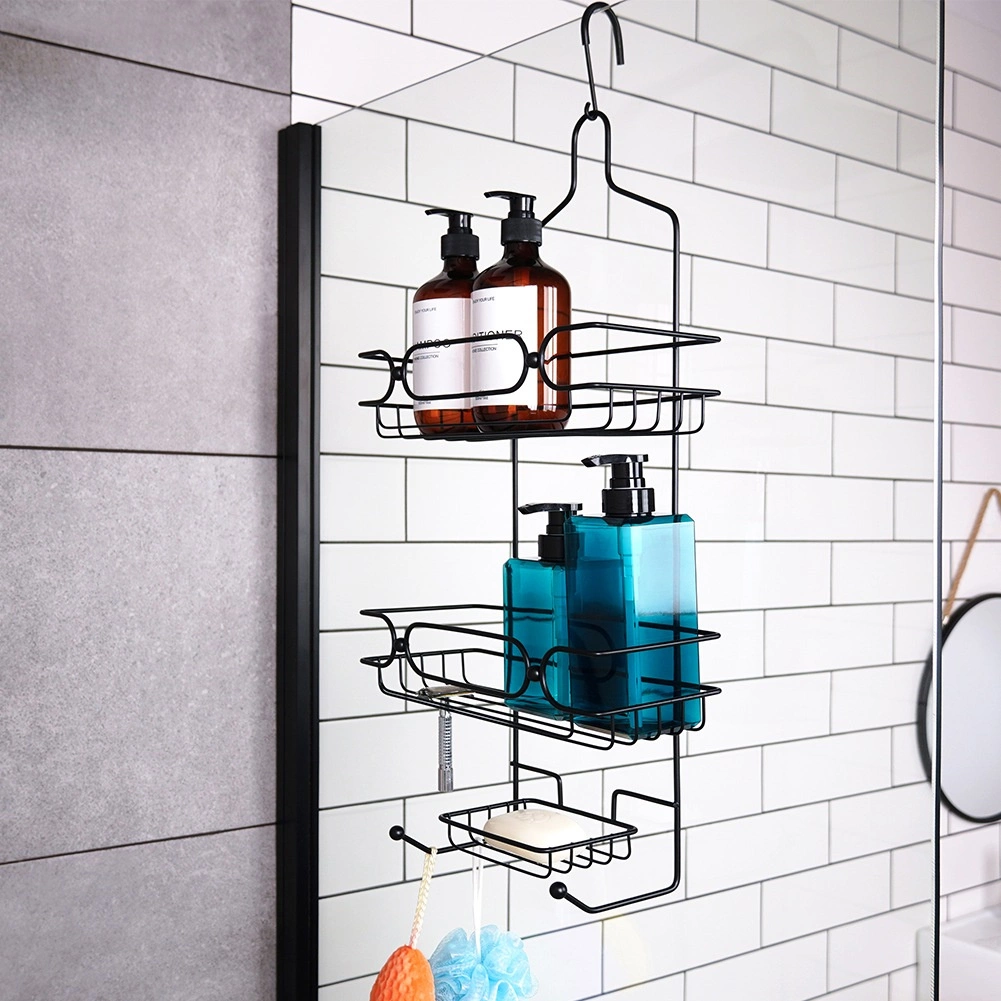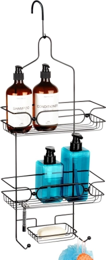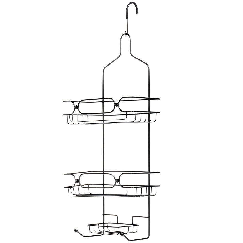 A minőségi, fekete festésű fém erős és korrózióálló, így a polc megbízhatóan bírja a mindennapos használatot. A függesztő akasztó gumiborítása védi az üveget és megakadályozza az elcsúszást. A két nagy polc elfértet samponokat és géleket, az alsó szappantartó és a két akasztó ideális szivacsokhoz, borotvákhoz vagy kefékhez.