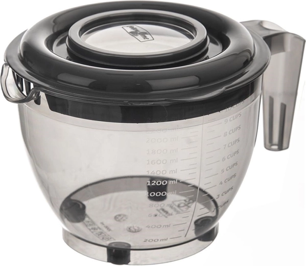 Pontos jelölések 200–2400 ml között és 1–10 csészéig terjedő skála, mely sütésnél és főzésnél időt és edényt spórol.