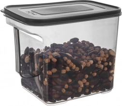 Tartson rendet a konyhában ezzel a 2,75 l-es univerzális száraztárolóval. A sötétszürke árnyalatú, áttetsző test lehetővé teszi a tartalom azonnali ellenőrzését nyitás nélkül, a masszív fedél kiváló tömítést és védelmet biztosít a nedvességgel és szagokkal szemben. A praktikus fül megkönnyíti a kezelést és a szekrényből való kivételt.