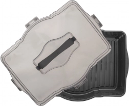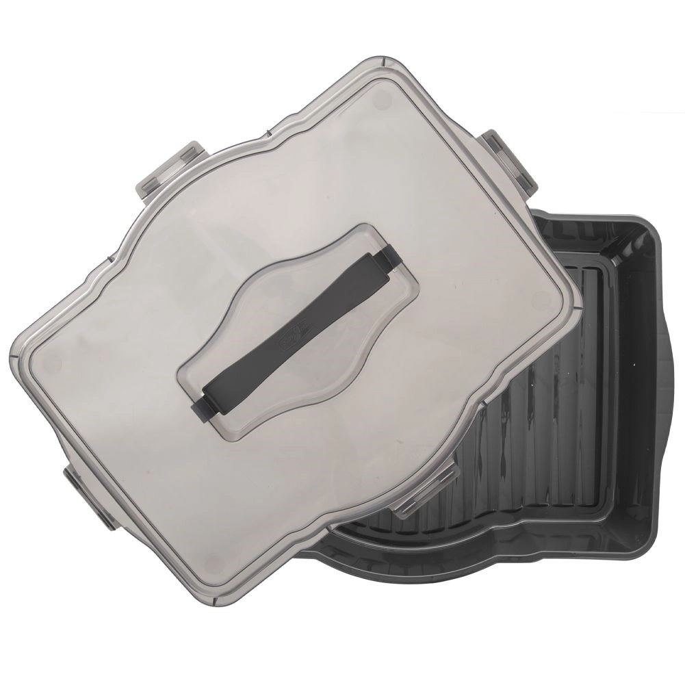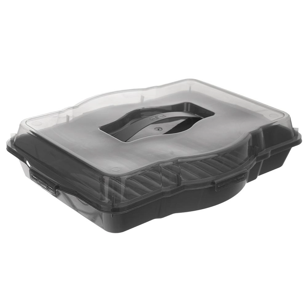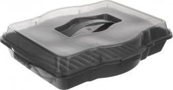 Nagy űrtartalmú doboz az ételek biztonságos szállításához és tárolásához otthon, vendégségben vagy kerti partin. Az átlátszó, beépített fogantyús fedél megkönnyíti a biztos hordozást, a négy masszív klipsz szoros zárást és védelmet biztosít a kiszáradással és a rovarokkal szemben. A robusztus, szürke kivitel bármely konyhába illik.