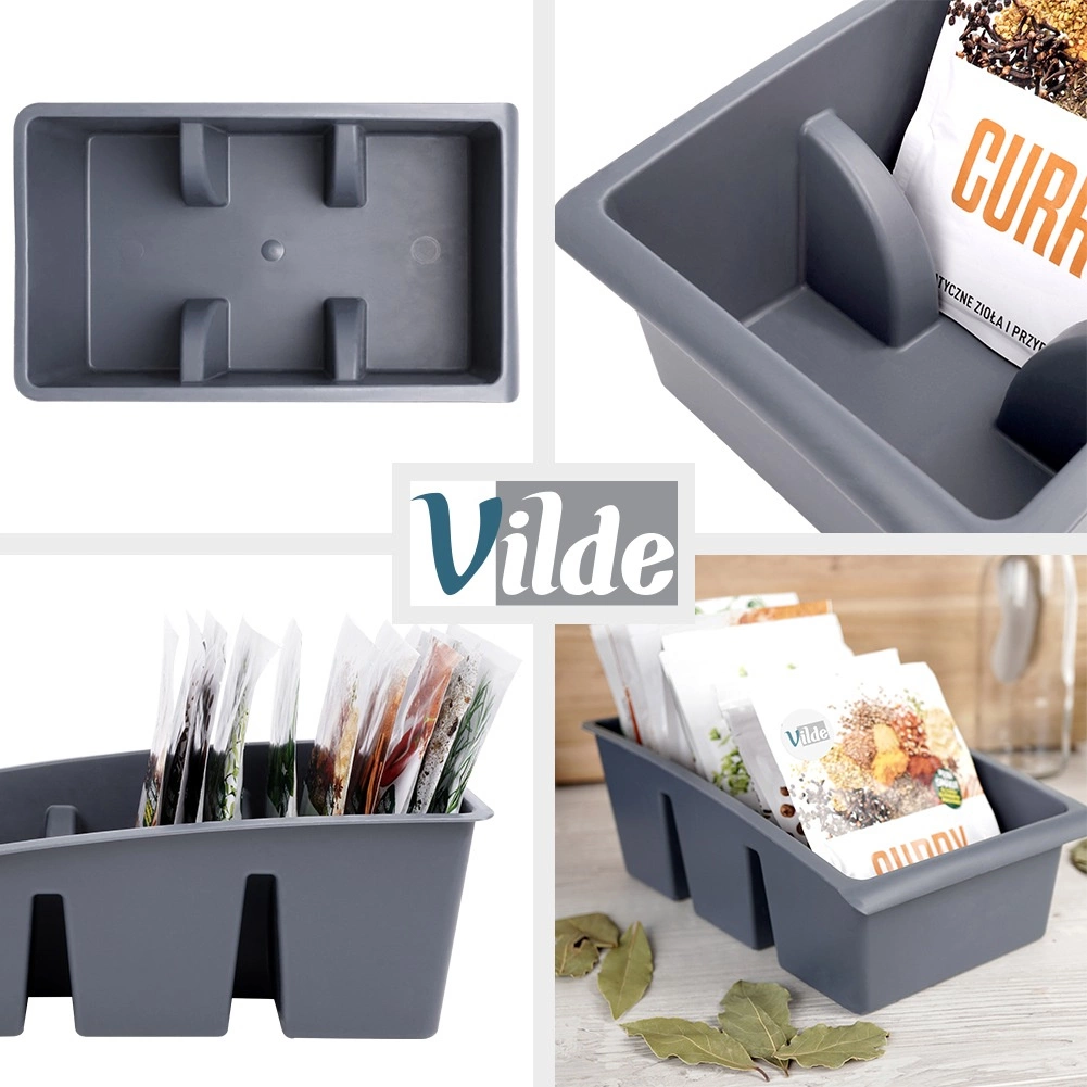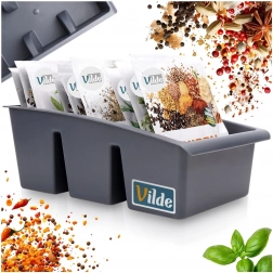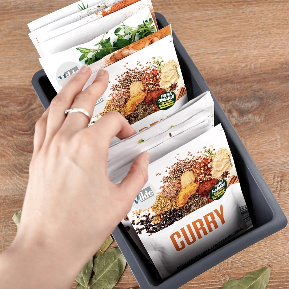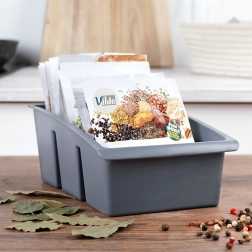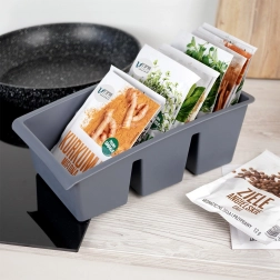 Ez a praktikus konyhai rendező áttekinthetően, mindig kéznél tartja a fűszer- és gyógynövénytasakokat. A két belső elválasztónak köszönhetően három részre osztott, így a fűszereket könnyen rendszerezheti típus vagy felhasználás szerint. Az alacsony elülső perem jó rálátást és a megfelelő tasak gyors kivételét biztosítja.