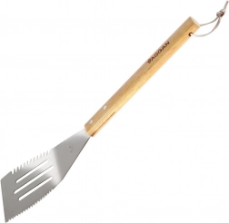 Masszív, rozsdamentes acél grillfordító hosszú fa nyéllel a biztonságos és kényelmes ételmozgatáshoz. A széles, nyílásokkal ellátott fej kiválóan elvezeti a zsírt, és rendelkezik fogazott élekkel a szeleteléshez, valamint éles peremmel a könnyű elválasztáshoz. A 40,5 cm-es hossz, a strapabíró kialakítás és a praktikus akasztófül révén ideális minden grillezéshez.