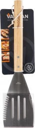 A VAGGAN fordító a strapabíró rozsdamentes acélt kombinálja az ergonomikus fa nyéllel a magabiztos fogásért a felforrósodott grill mellett. A nyílásokkal ellátott fej megkönnyíti a felesleges zsír elvezetését, míg a fogazott élek és az élezett oldal alkalmasak burgerek, zöldségek és kolbászok szeletelésére közvetlenül a rácson.
