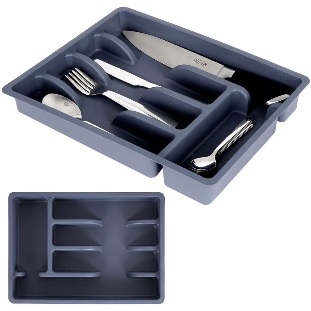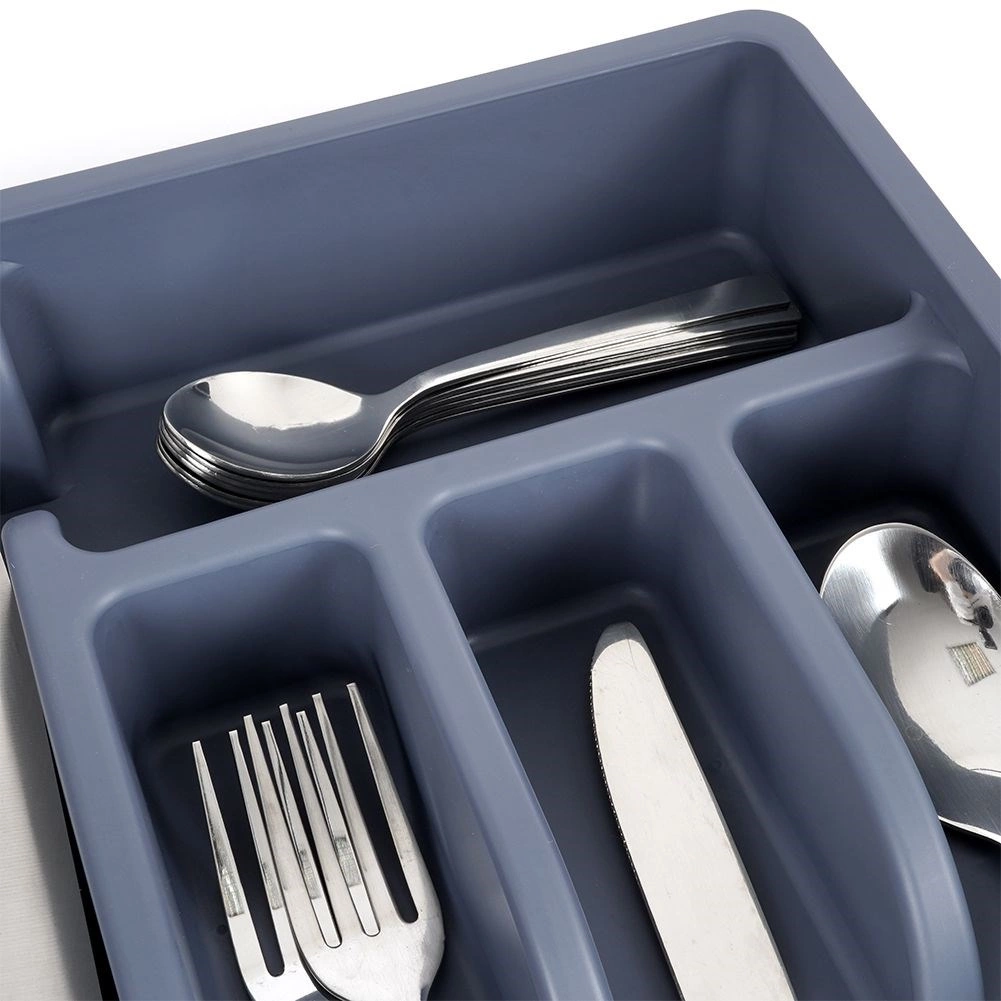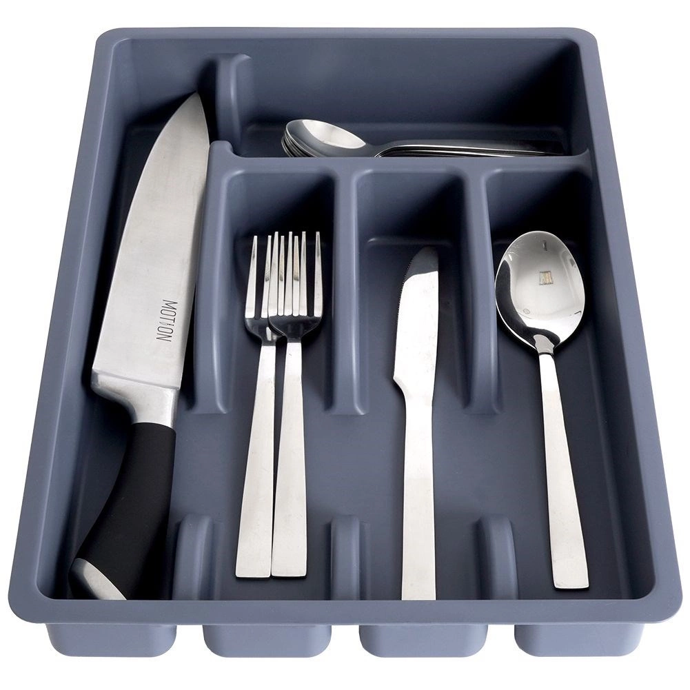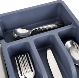 Három szekció az evőeszközöknek, külön rekesz a kiskanalaknak és egy hosszú rész a konyhai eszközöknek, hogy minden a helyén maradjon.