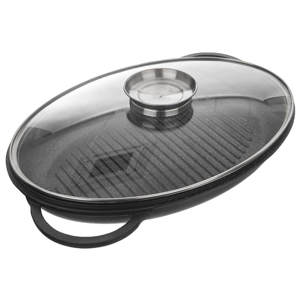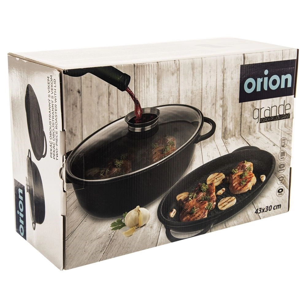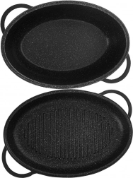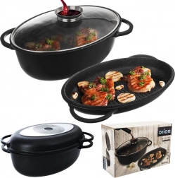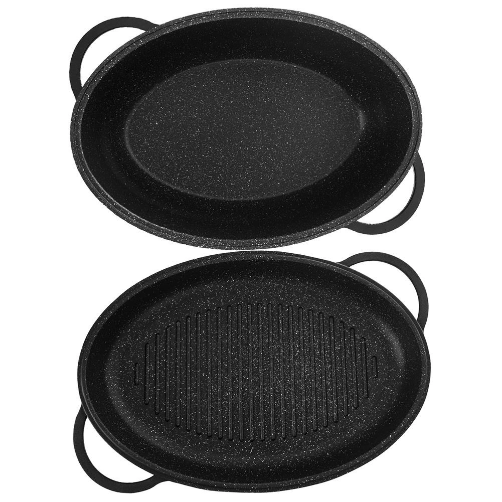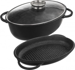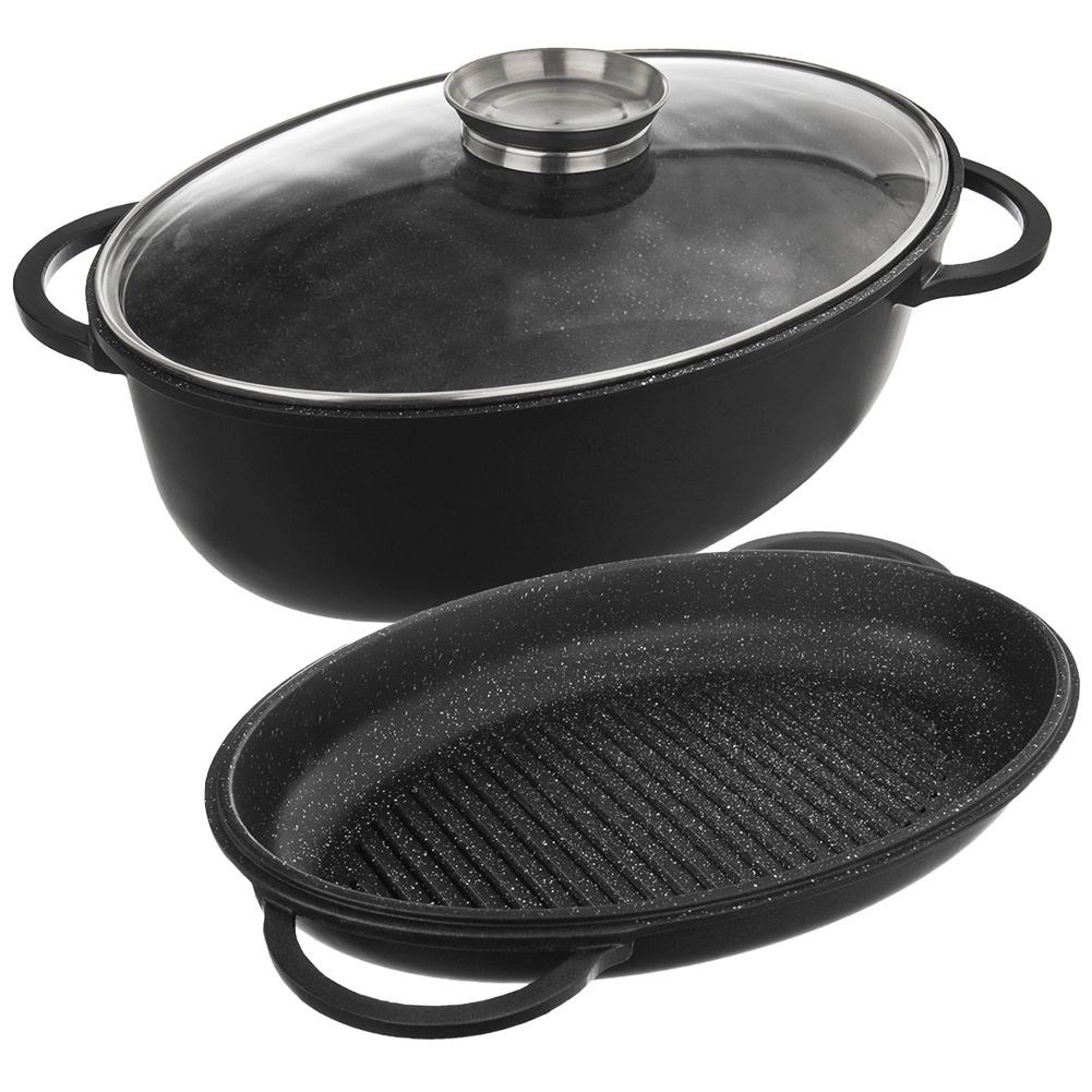 Ez az átgondolt készlet egy mély, ovális, 10 l-es tepsit, egy grillserpenyőt, amely fedőként is használható, valamint egy különálló, hőálló üvegfedőt tartalmaz adagolóval. A tartós öntött alumínium szerkezet kiválóan tárolja a hőt, a PFLUON GRANIT gránit tapadásmentes réteg pedig megakadályozza az odaégést, így minimális olajjal készíthetőek az ételek.