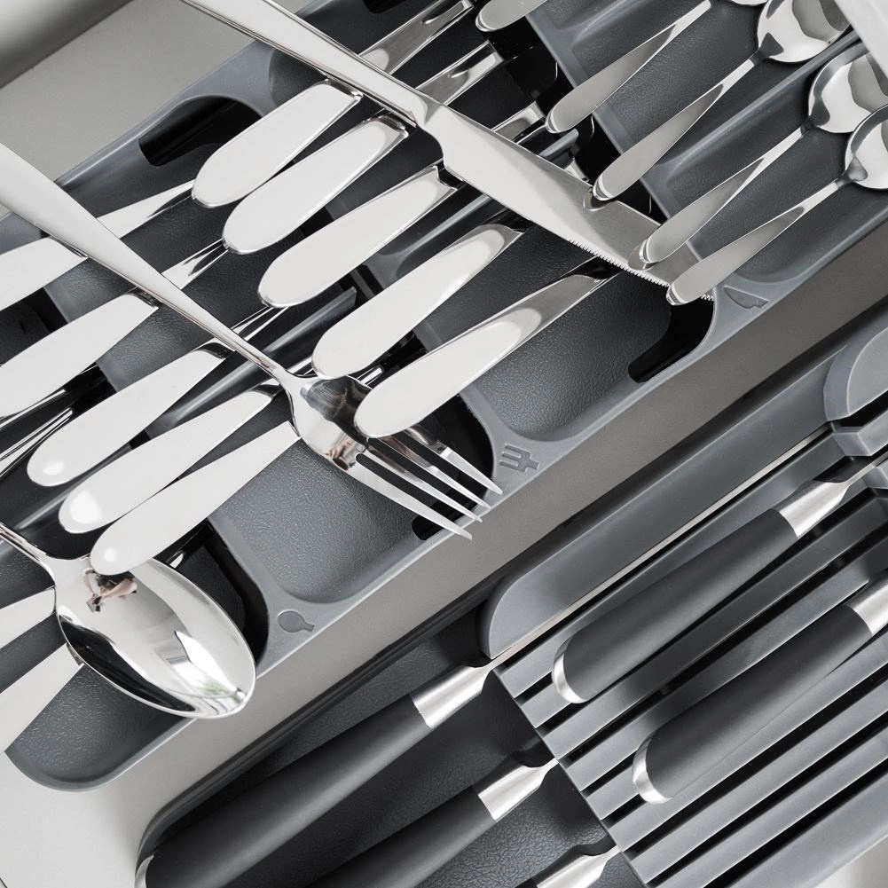 Kilenc, átgondoltan elrendezett rekesz és a többszintű tárolás gondoskodik róla, hogy minden evőeszköz a helyén és jól áttekinthetően legyen kéznél.