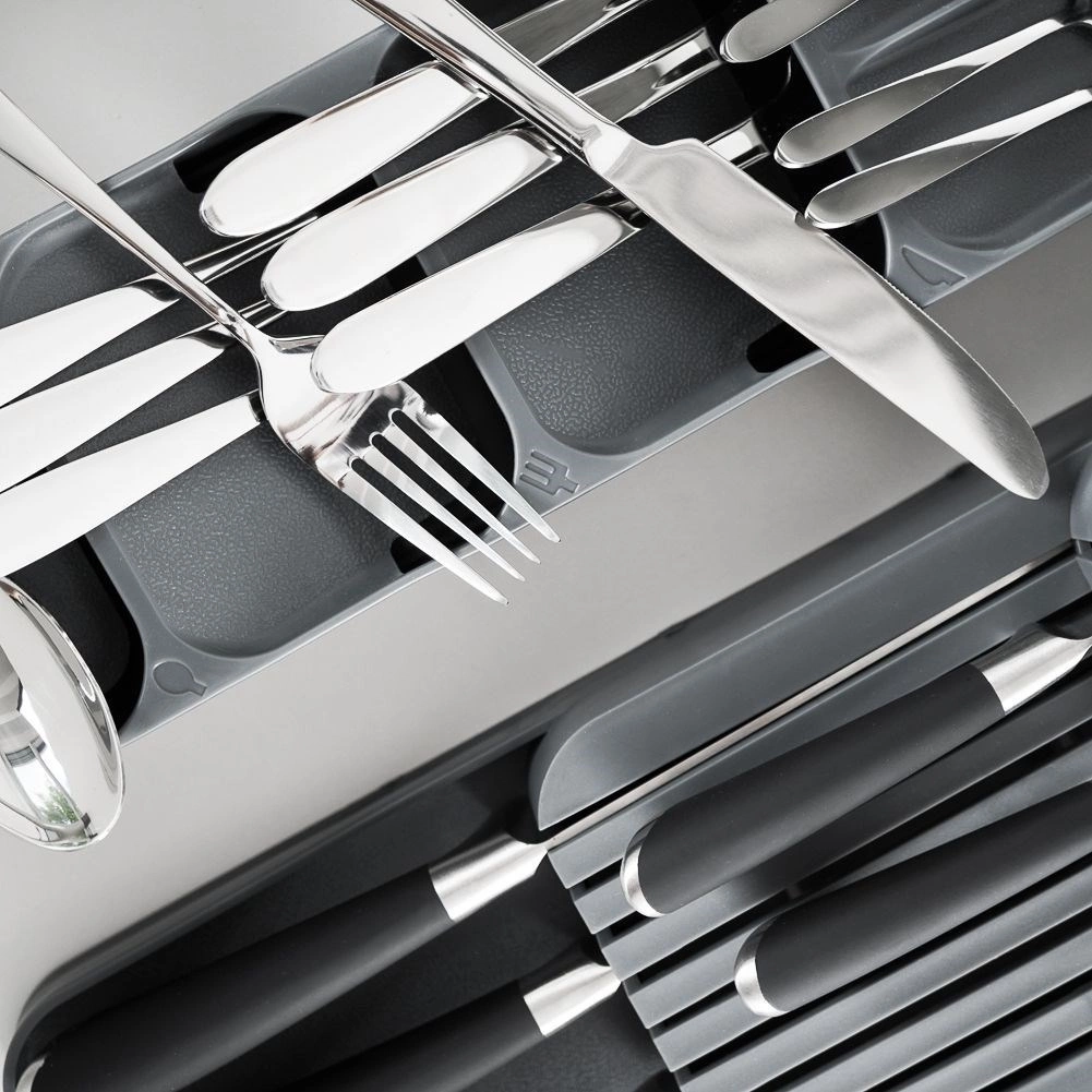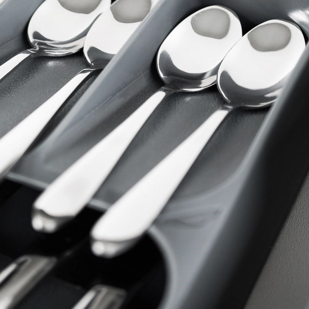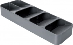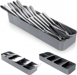 A minőségi, elegáns szürke műanyagból készült, tartós kivitel könnyű tisztítást és hosszú élettartamot biztosít. Ideális kanalak, villák, kések, valamint kis kanalak és kis villák tárolására, mindennek megvan a maga helye.
