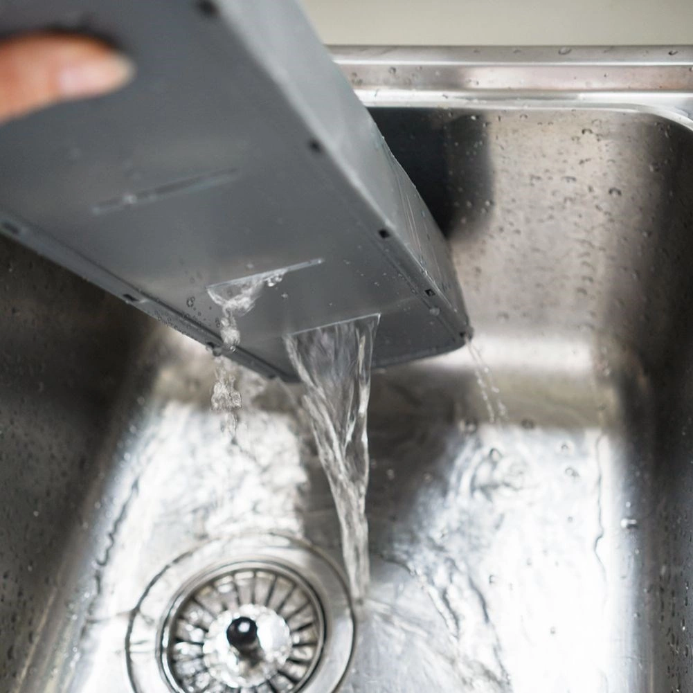 A sima, masszív, szürke műanyag könnyen karbantartható, és bírja a mindennapos használatot.