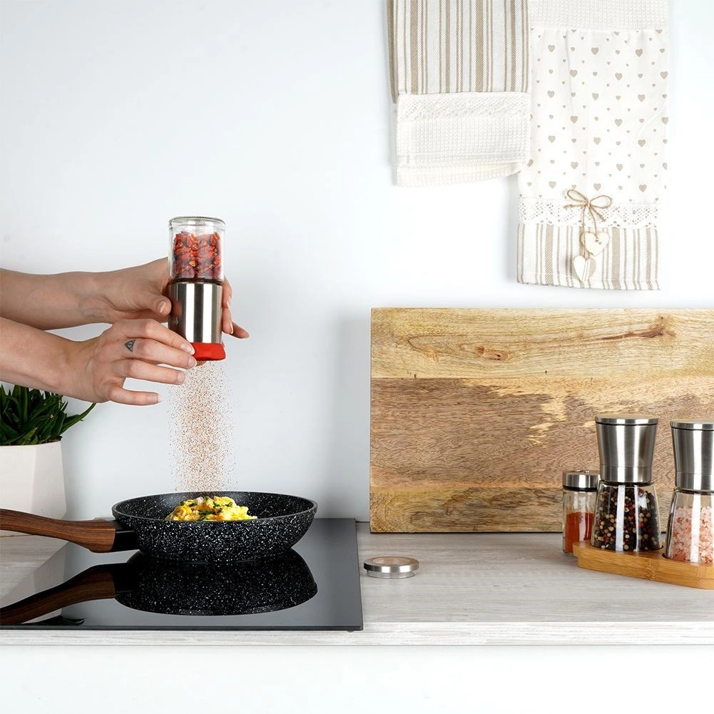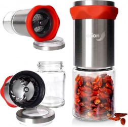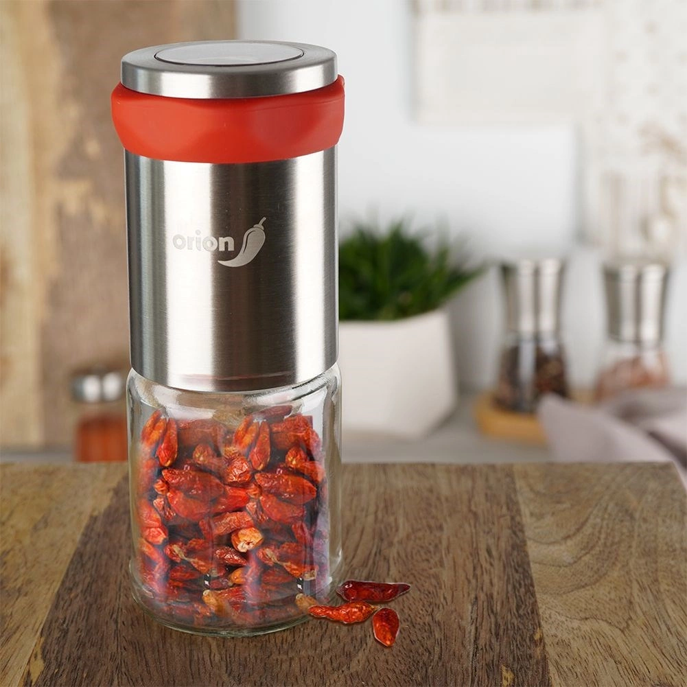 Stílusos kézi daráló chilipaprikához, borshoz és fűszernövényekhez, amely frissen őrölt fűszert kínál közvetlenül tálalás előtt. Üveg tartályt kombinál strapabíró rozsdamentes acél mechanizmussal, amely finoman és hatékonyan szeleteli a szárított paprikát zúzás nélkül. Ergonomikus forma csúszásmentes markolattal a kényelmes fogásért, elegáns designja dísze bármely konyhának. A csomag része a védőkupak a nedvesség ellen a hosszabb frissességért.