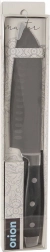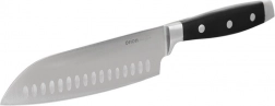 Univerzális santoku kés mindennapi főzéshez, 33 cm-es teljes hosszal, amely pontos szeletelést és kényelmes fogást biztosít. Minőségi rozsdamentes acélból készült, hollow/granton kivágásokkal az étel rátapadásának csökkentésére, 18,5 cm-es éles pengével és ergonomikus, három szegeccsel rögzített ABS nyéllel a biztonságos, stabil fogásért.