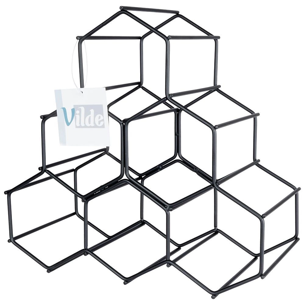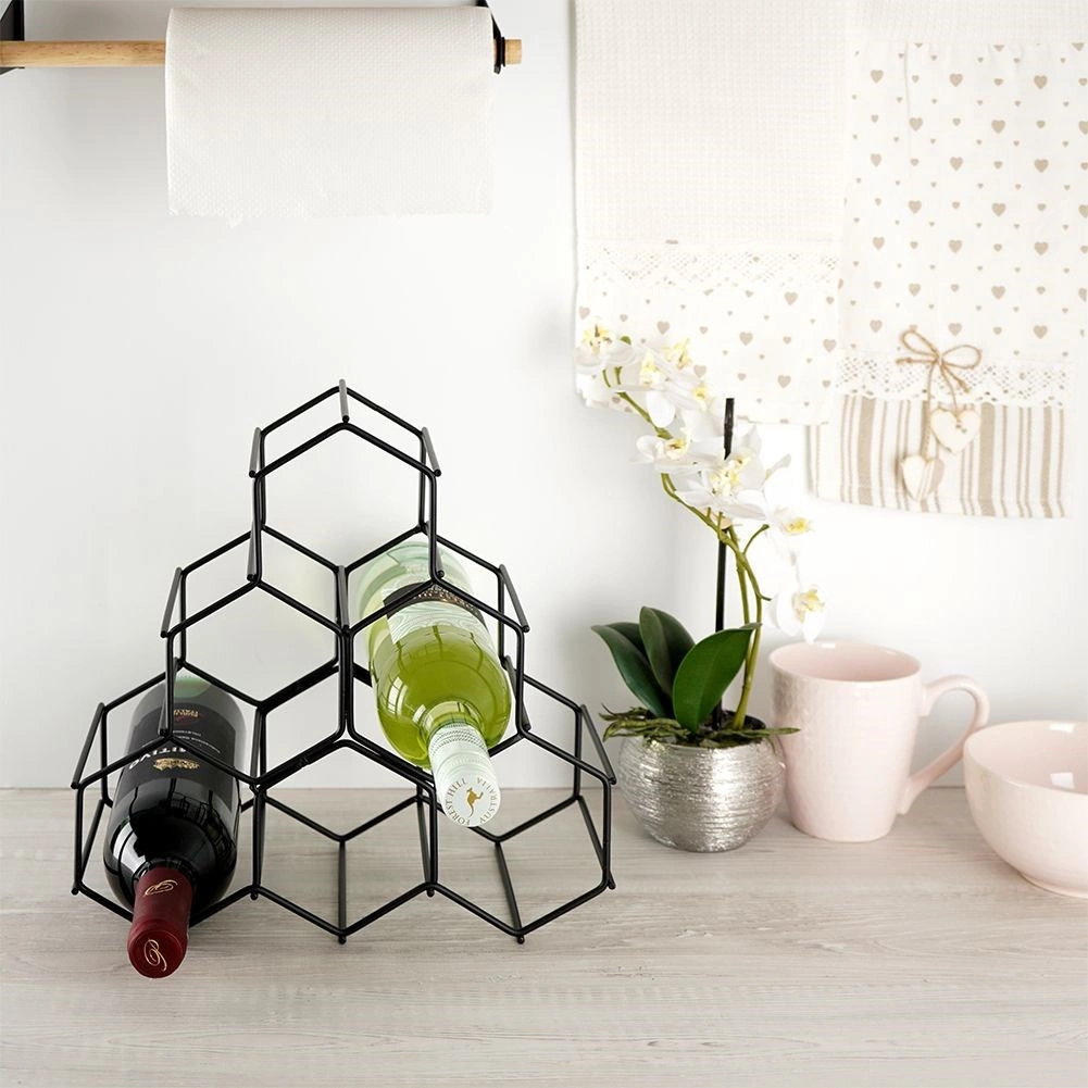Ez a praktikus borosállvány akár 6 palackot is befogad, és optimális helyzetben tartja azokat a dugó és az íz megőrzése érdekében. A masszív fém szerkezet matt fekete színben hosszú élettartamot és biztonságot nyújt a mindennapi használat során. Kompakt méreteinek köszönhetően, 29,5 × 14,5 × 28,5 cm, könnyedén elfér a konyhapulton, polcon vagy komódon.