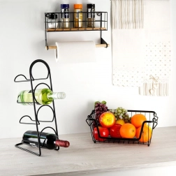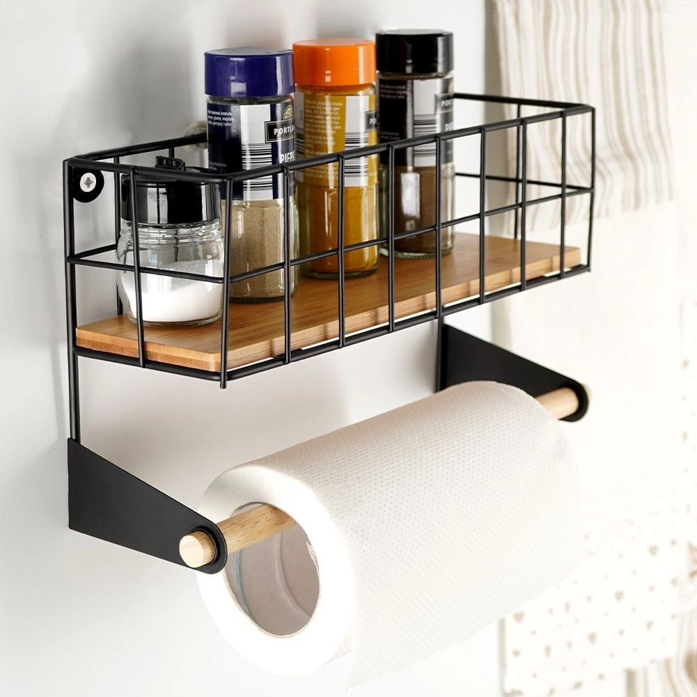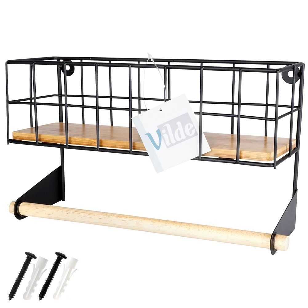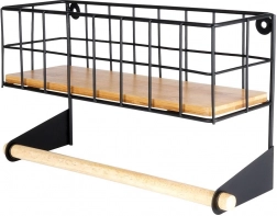 Ez a falra szerelhető polc integrált papírtörlő-tartóval okosan rendszerezi a konyhát. A felső kosár elfér benne a fűszerkészlet vagy kisebb dobozok, az alsó fa rúd kényelmes papírtörlő-lecsévélést biztosít. A porszórt fekete fém tartós kialakítása és a bambusz kiegészítők modern, ipari megjelenést kölcsönöznek a térnek.