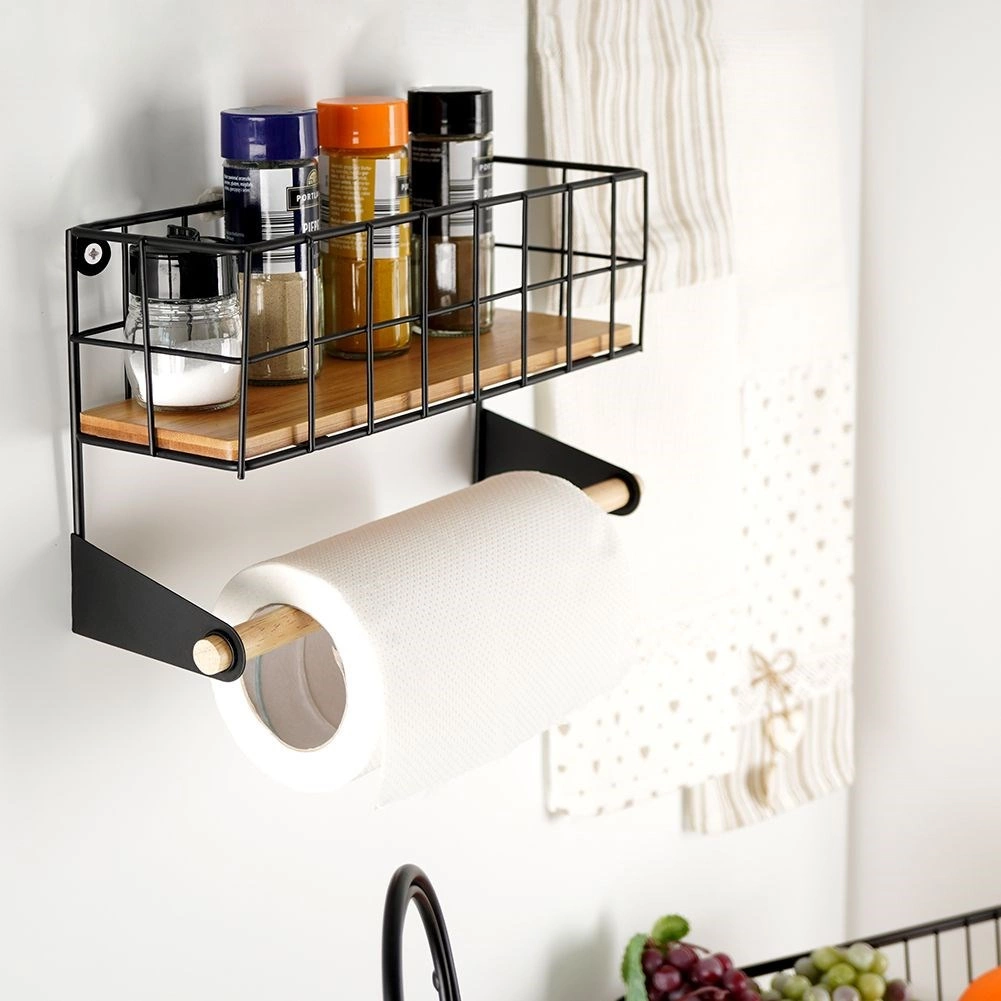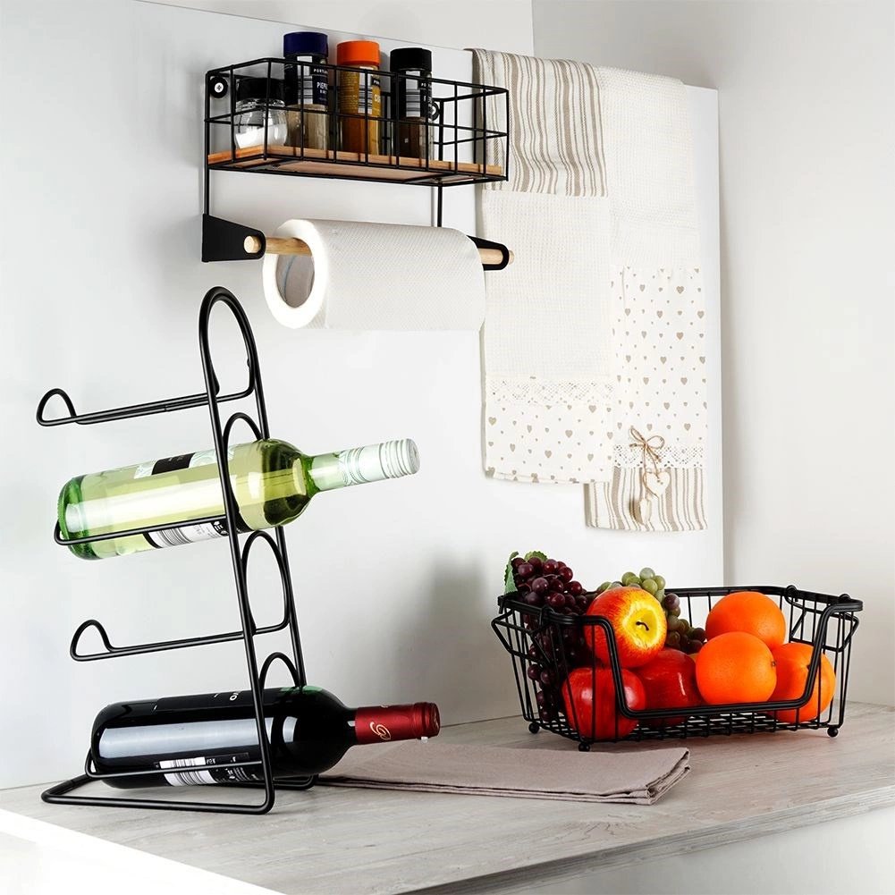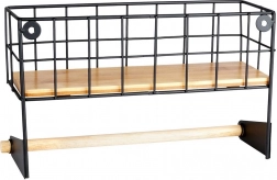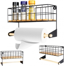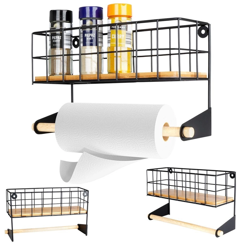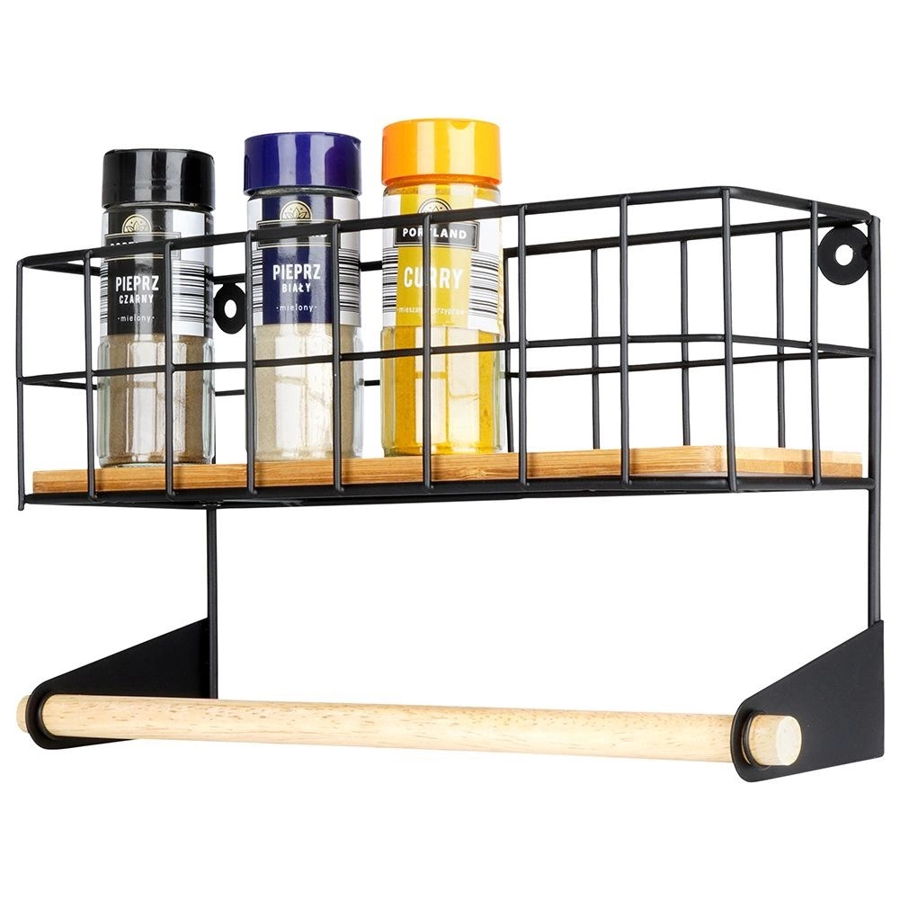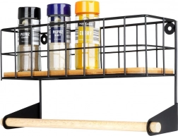 A felső kosár a fűszereknek, az alsó fa rúd a papírtörlőnek biztosít helyet, így minden kéznél van és rendben marad.