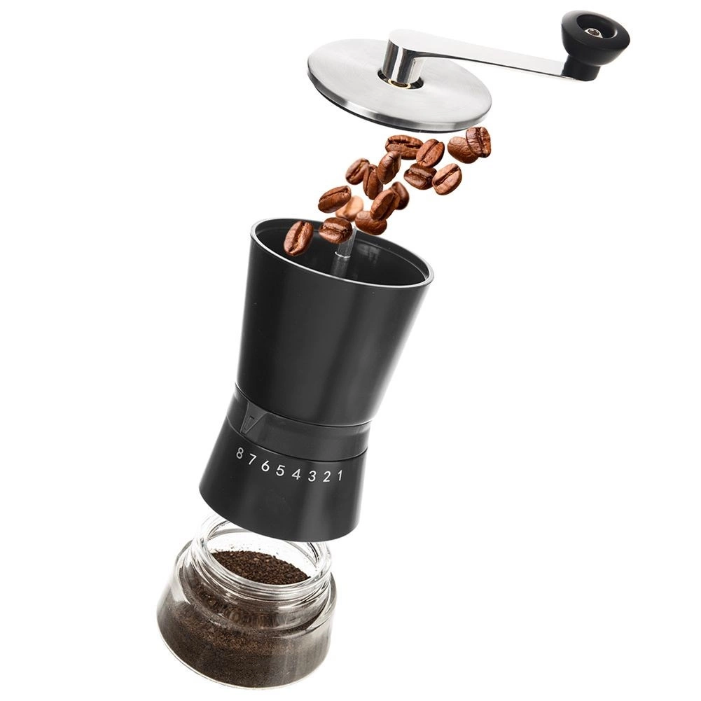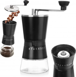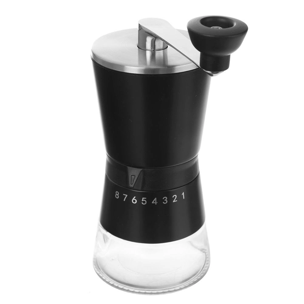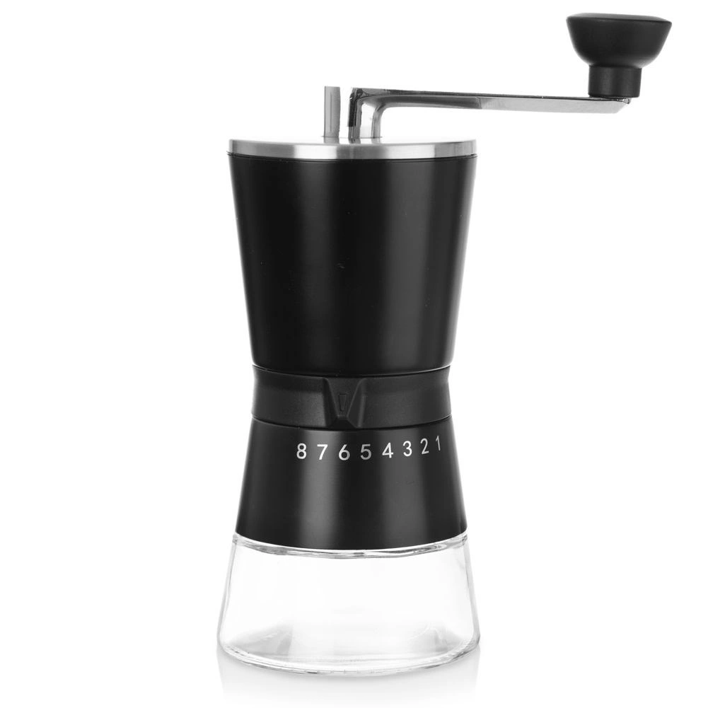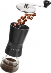 A matt, csúszásmentes felületű rozsdamentes acél test tartós és kényelmes fogású. Az alsó átlátszó üveg tartály lehetővé teszi az őrölt kávé mennyiségének ellenőrzését. A fém kar kényelmes fogással egyenletes, erőlködés nélküli őrlést biztosít.
