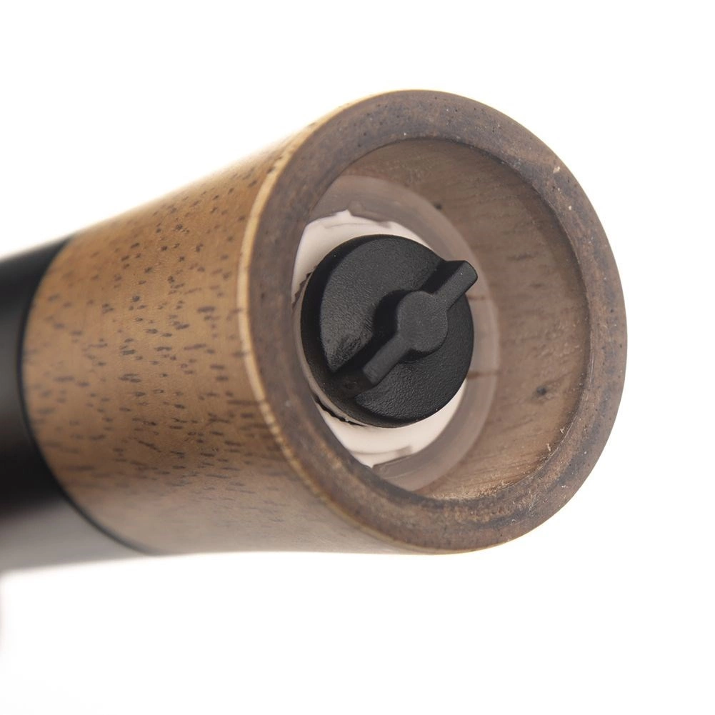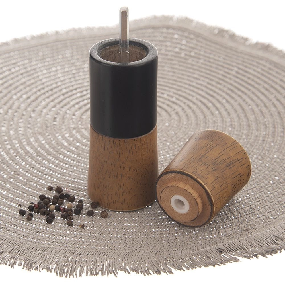 Stílusos kézi őrlő borshoz, sóhoz és egyéb fűszerekhez, 15,5 cm magassággal, amely a természetes fát fekete elemekkel kombinálja. Kerámia őrlőszerkezettel, folyamatos szemcseméret-szabályozással és ergonomikus formával a kényelmes használatért. A frissen őrölt fűszerek intenzív aromát és ízt adnak az ételeknek, az őrlő pedig egyben elegáns kiegészítője lesz a konyhának.