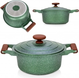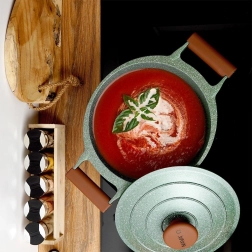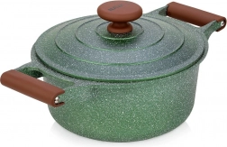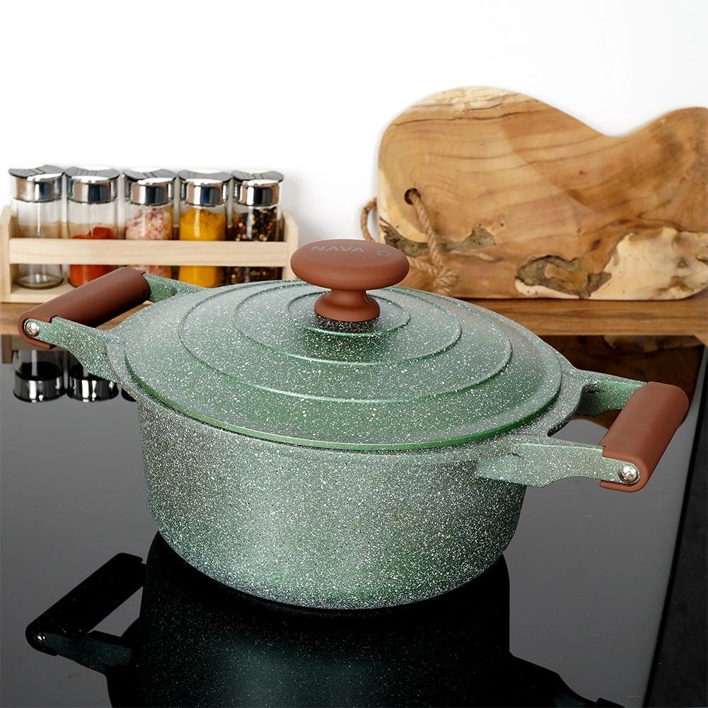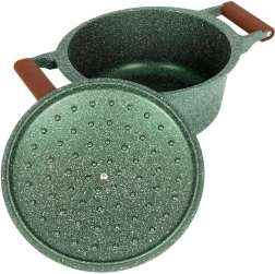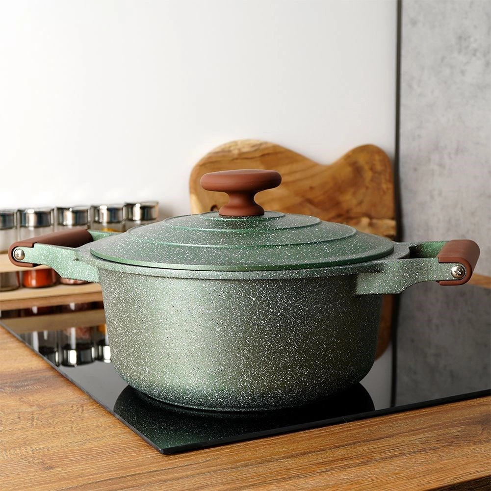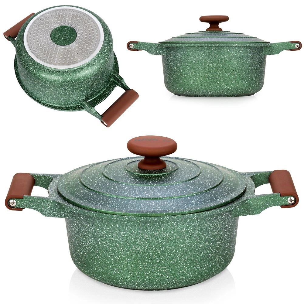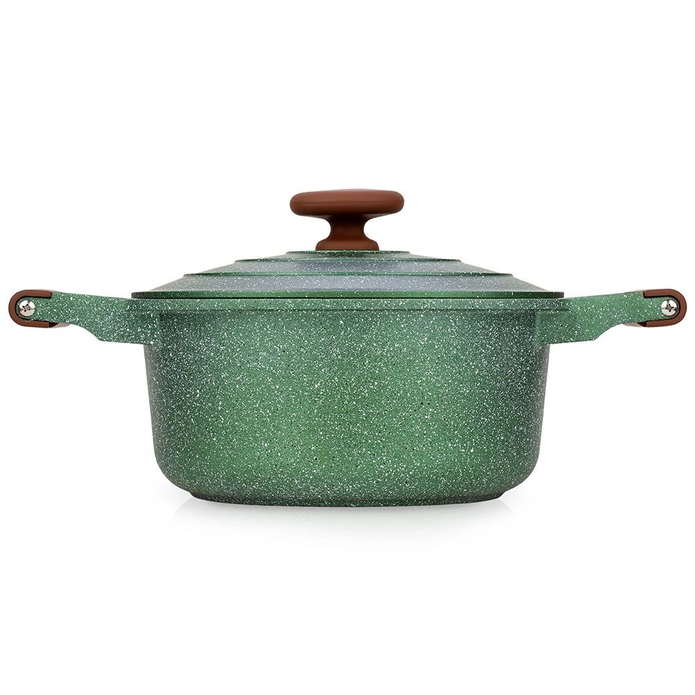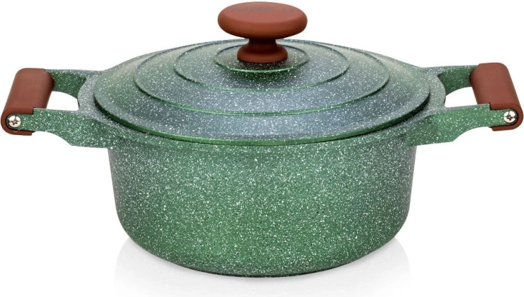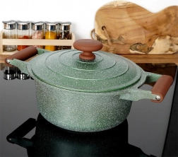 Fedezd fel a praktikusság és az elegancia találkozását. Ez a sötétzöld gránit lábas barna, puha tapintású fogantyúkkal időtlen megjelenésével és kiváló teljesítményével hódít. Az ötrétegű gránit felület tapadásmentességet, magas hőmérséklettel szembeni ellenállást és könnyű tisztíthatóságot biztosít, így a főzés gyors, egészséges és felesleges zsiradék nélküli.