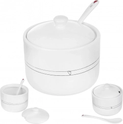 Minőségi fehér kerámiából készült, amely könnyen tisztítható. A cukortartó és a kanál is mosogatógépben mosható.