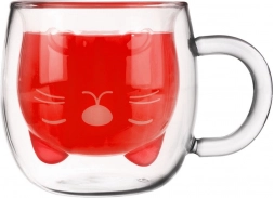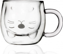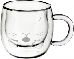Stílusos termos pohár cica motívummal, 270 ml űrtartalommal, amely dupla fallal biztosít kiváló hőszigetelést. Könnyű boroszilikát üvegből készült, és ideális kávéhoz, teához, kakaóhoz és tejhez. Kényelmes füle révén kellemes a fogása, és az italok benne különlegesen látványosan mutatnak.