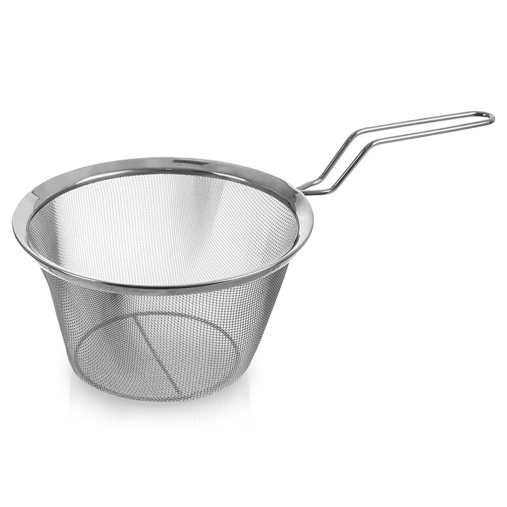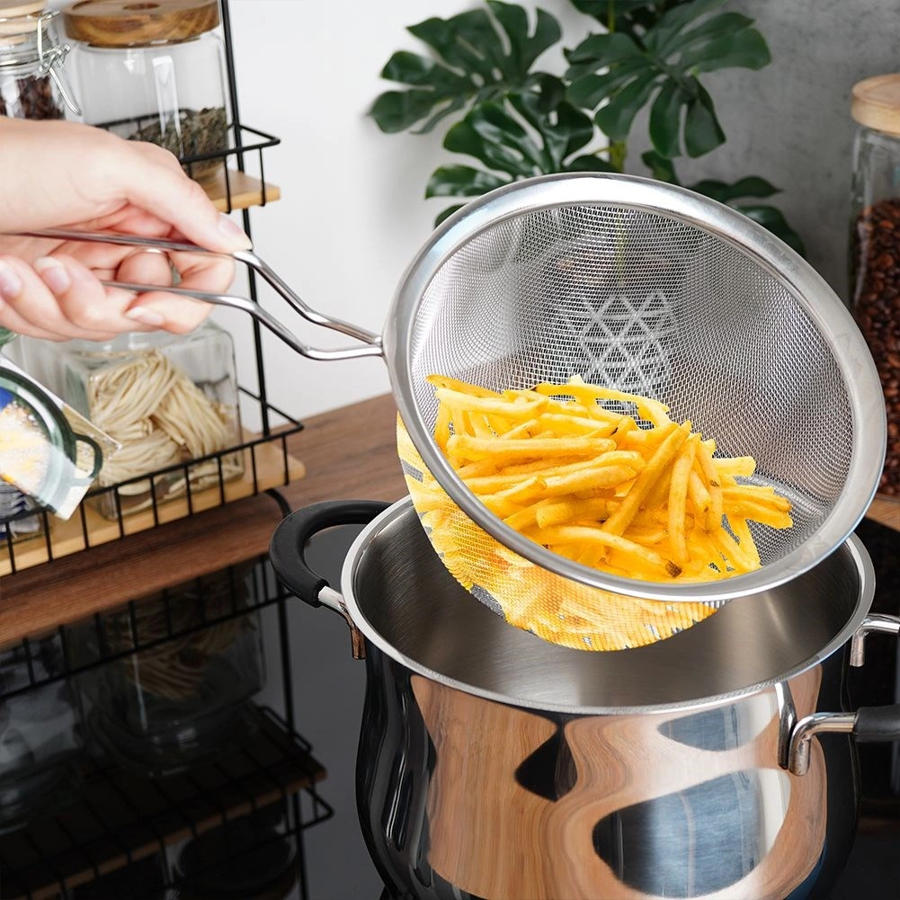 A rozsdamentes acél finomháló gyorsan lecsepegteti a tésztát, zöldséget és hasábburgonyát, és megakadályozza az apró darabok kihullását.