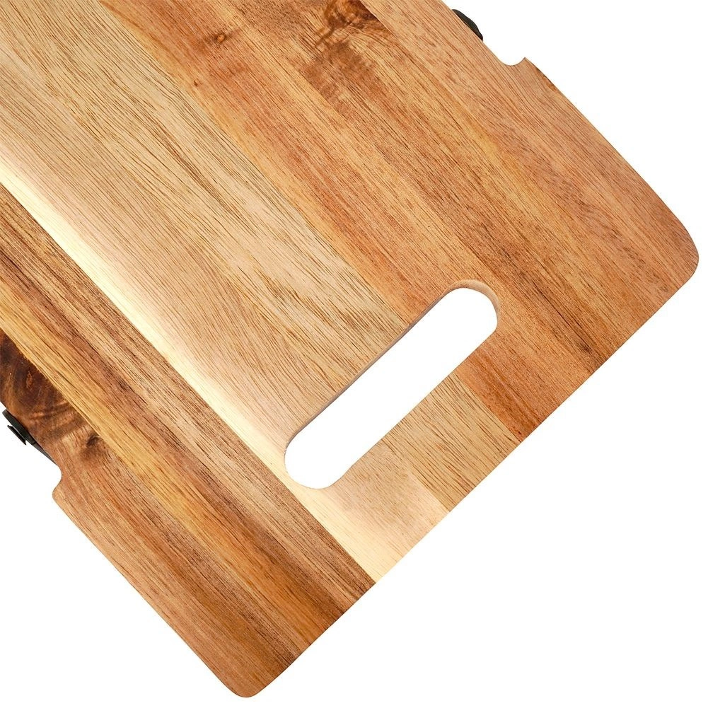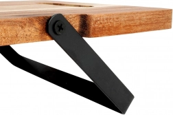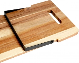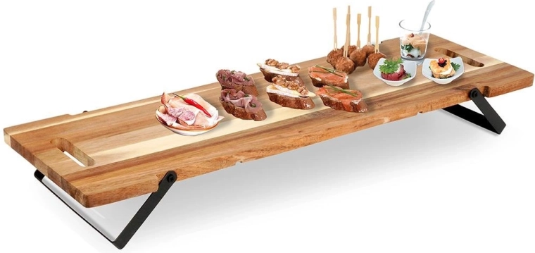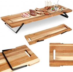Elegáns akácfából készült szervírozótálca kihajtható fém lábakkal az ételek látványos prezentálásához. Integrált fogantyúkkal a könnyű hordozásért, stabil, megemelt kialakítással és strapabíró, természetes felülettel, amely ideális sajtokhoz, felvágottakhoz, gyümölcsökhöz, tapasokhoz és desszertekhez.