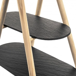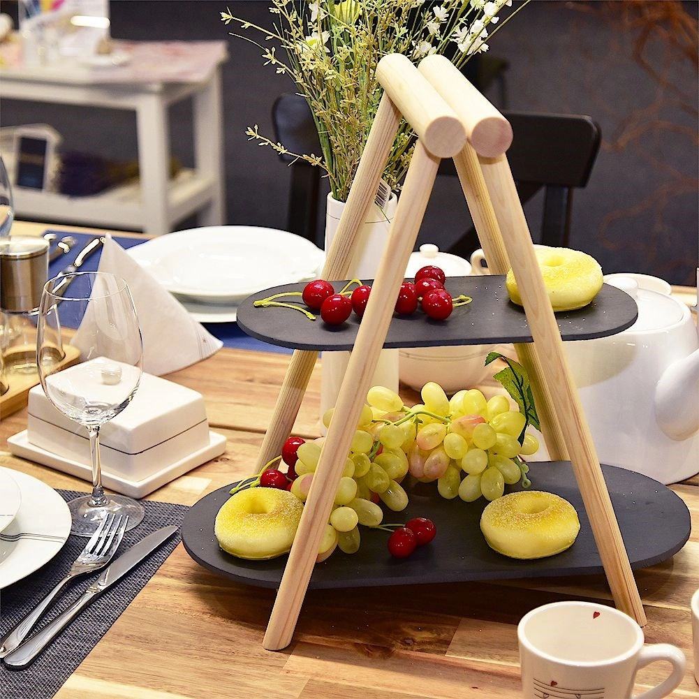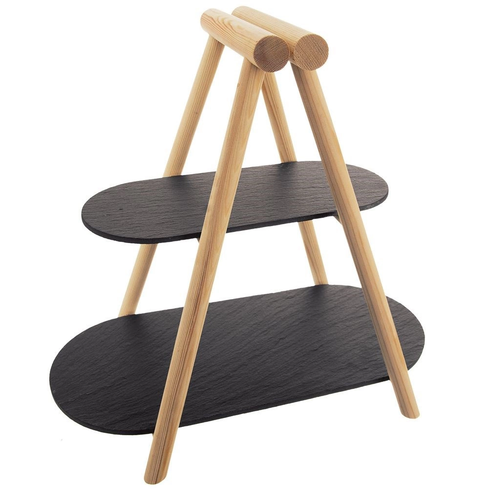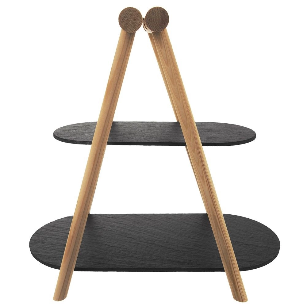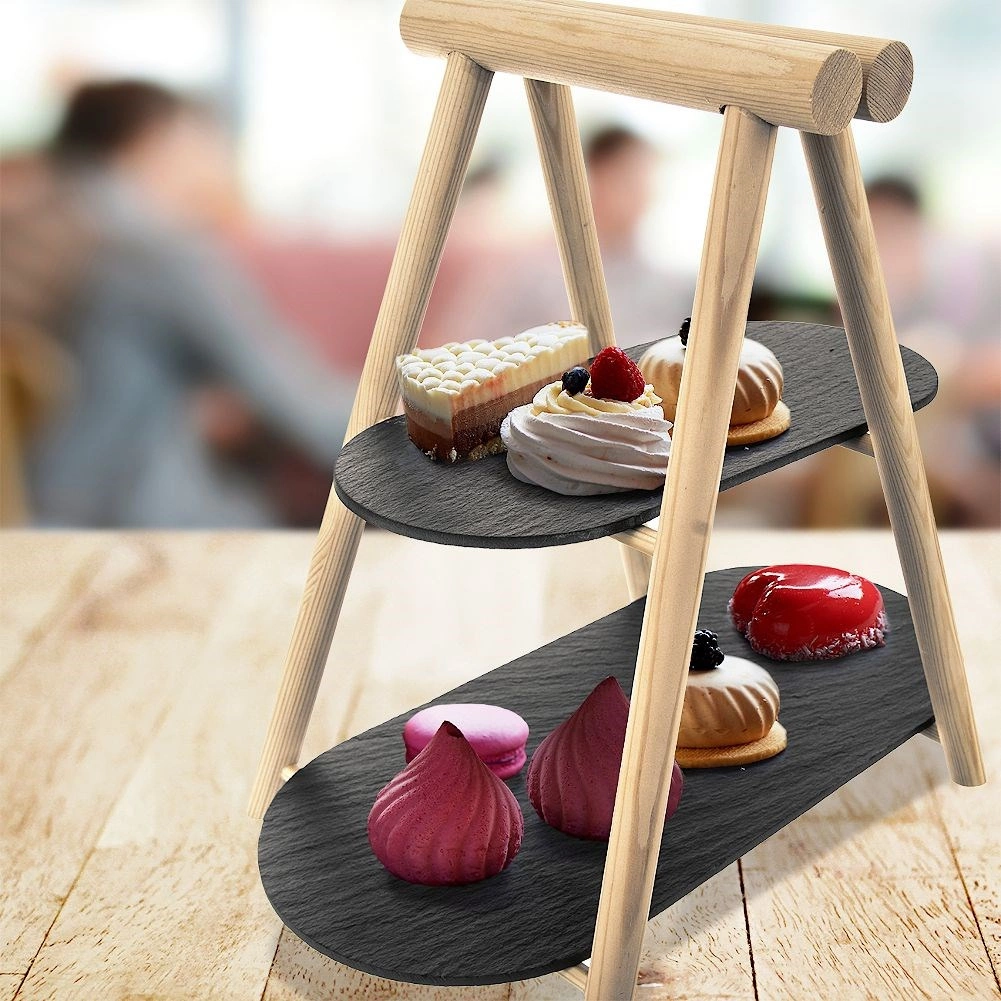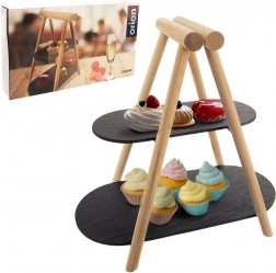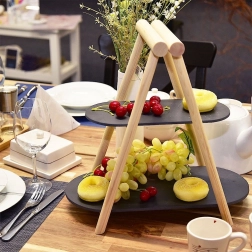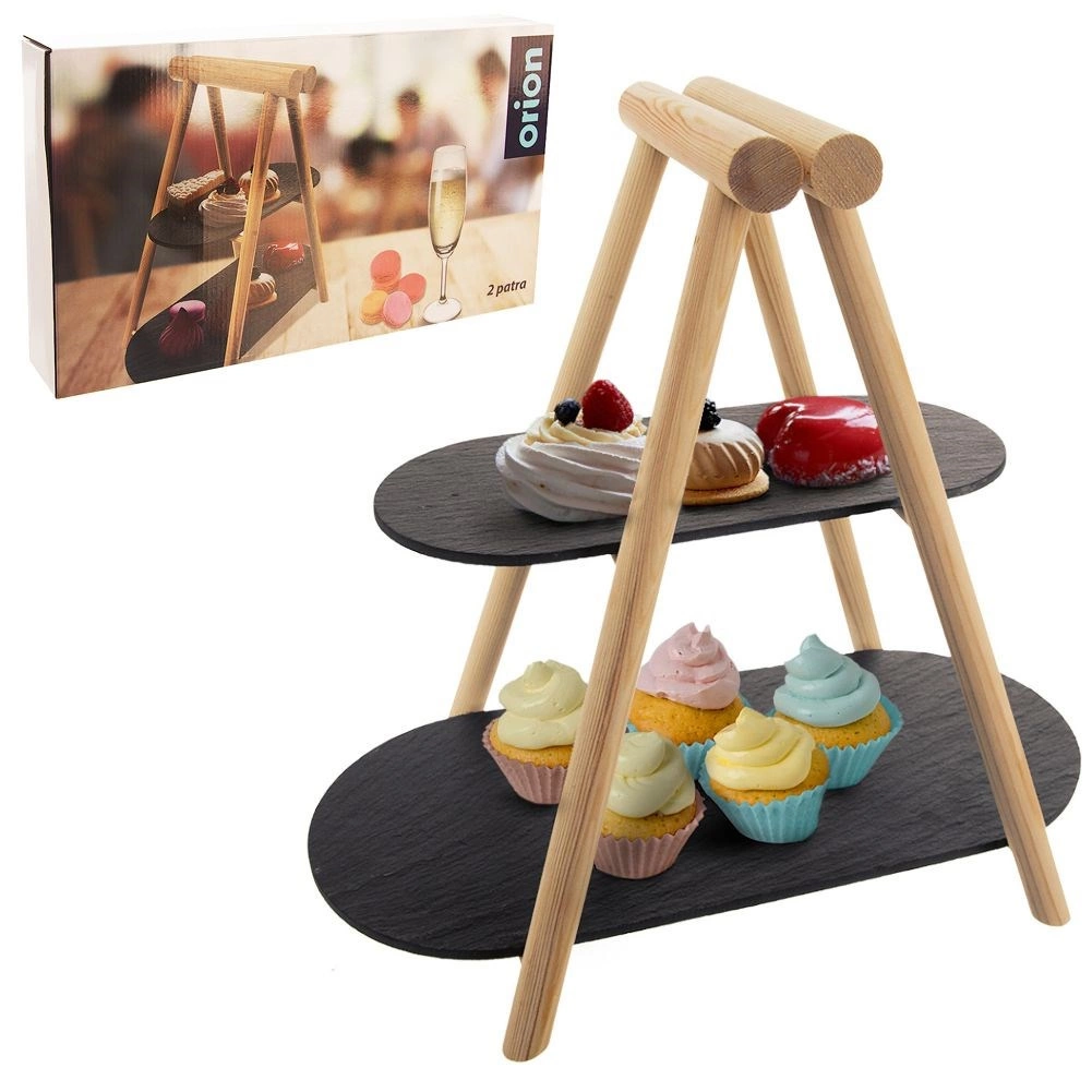Ez a dizájnos, kétszintes tálaló állvány minden asztalon remekül mutat. A világos fa és a sötét palatálak párosa modern, mégis időtálló hatást kelt. A két szintnek köszönhetően helyet spórol, és látványos bemutatást tesz lehetővé süteményeknek, gyümölcsnek, sajtoknak, felvágottaknak vagy falatkáknak.