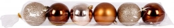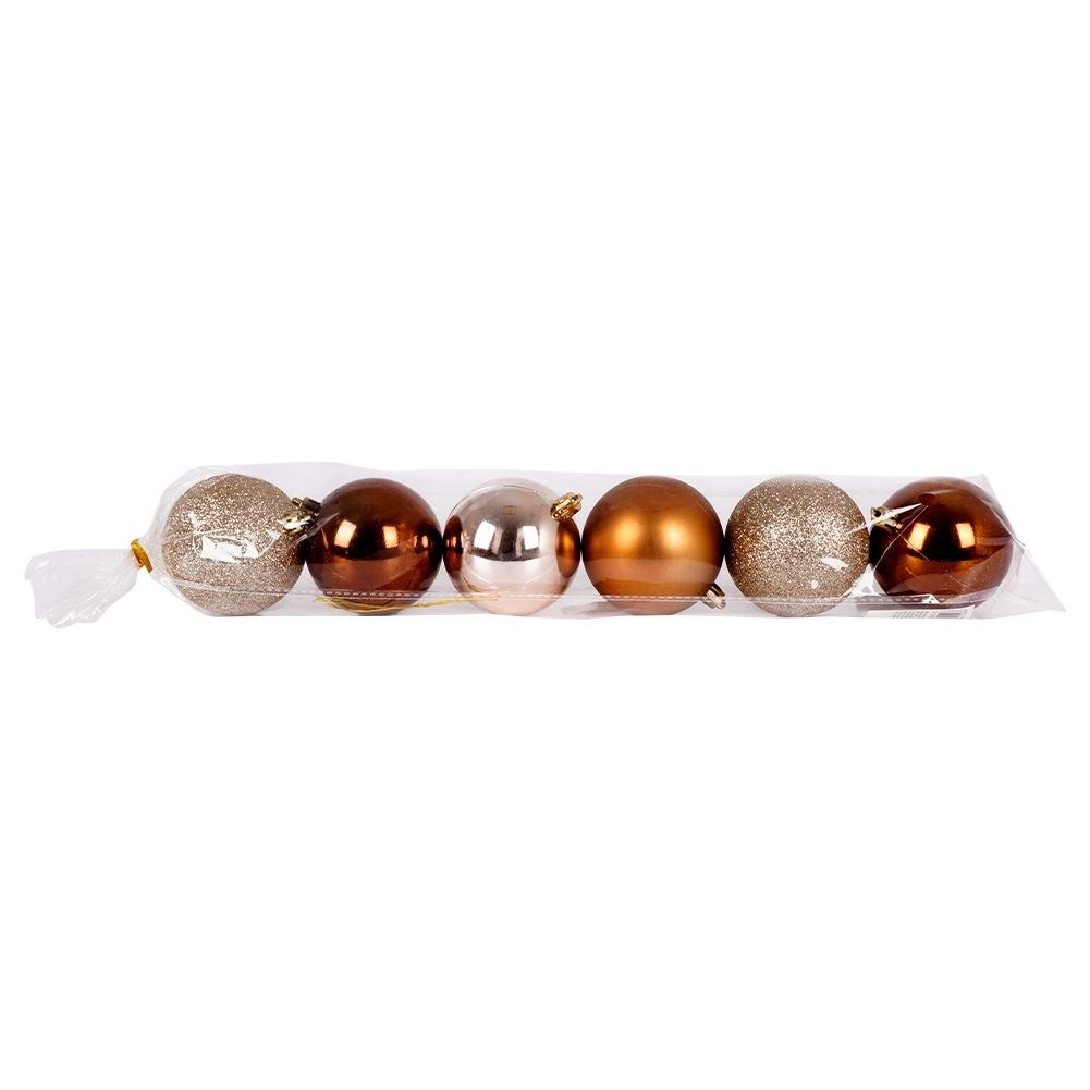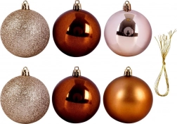 Stílusos, hat darabból álló karácsonyi díszkészlet meleg borostyán és gyöngyház árnyalatokban, amely dekórjának eleganciát és ünnepi csillogást kölcsönöz. A 7 cm átmérőjű gömbök fényes, matt és brokát felülettel készülnek, és a minőségi műanyagnak köszönhetően törhetetlenek, így gyermekes és kisállatos otthonokban is biztonságosak.