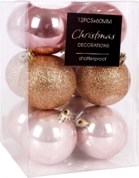 A készlet 12 darab, 6 cm átmérőjű gömböt tartalmaz háromféle felülettel a változatos vizuális hatásért: 4× fényes, 4× csillogó, 4× matt. A gömbök fém kupakkal és akasztóval készülnek, a csomagban zsinórok is találhatók az egyszerű felakasztáshoz. Minden átlátszó dobozban, rendezetten csomagolva – karácsonyi ajándéknak is ideális.
