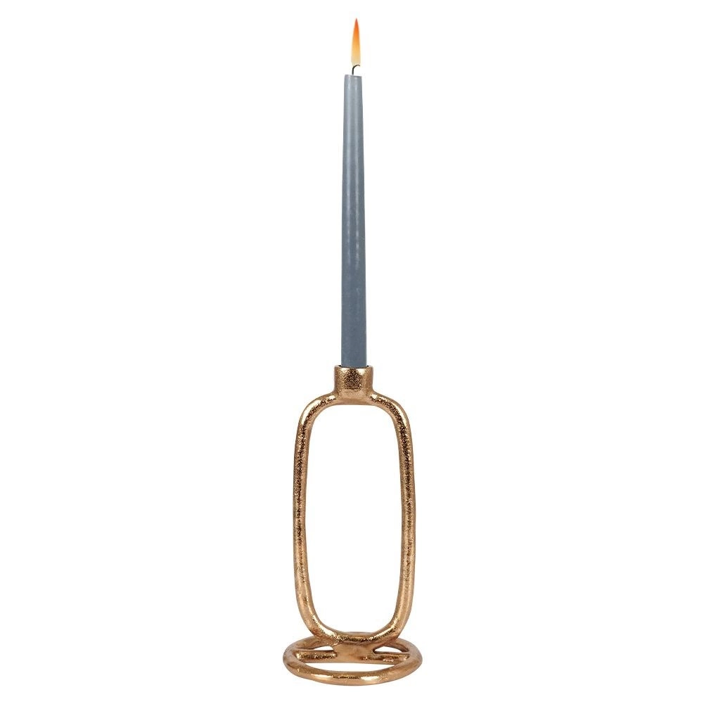 Ez az arany, LOFT stílusú fém gyertyatartó letisztult vonalaival és finom felületi textúrájával tűnik ki. Minőségi alumíniumból készült, amely könnyű, ugyanakkor tartós és stabil. Klasszikus hosszú gyertyákhoz (max. Ø 2 cm) alkalmas, és szépen mutat asztalon, komódon vagy ablakpárkányon.