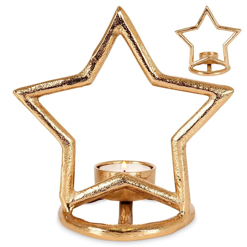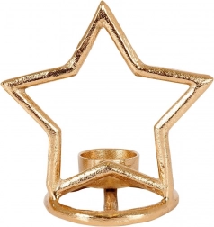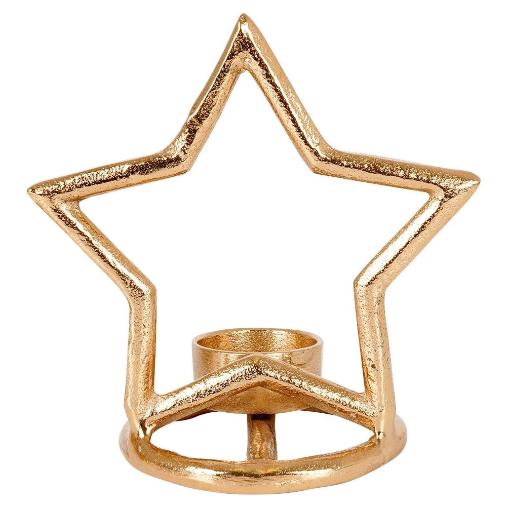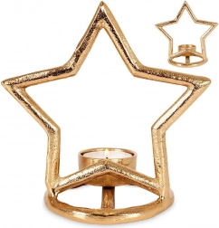 Elegáns, csillag alakú mécsestartó minőségi alumíniumból, modern arany színben, amely szépen feldobja az asztalt, polcot vagy komódot. Ideális teamécsesekhez, és a stabil, kerek talpnak köszönhetően biztonságosan áll bármilyen felületen. Minimalista megjelenését könnyű összehangolni LOFT, indusztriális vagy skandináv stílusú enteriőrökkel.