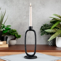 Modern fekete alumínium gyertyatartó hosszú gyertyához, amely eleganciát és minimalista stílust ad az enteriőrnek. Stabil, kör alakú talppal rendelkezik, illik loft/indusztriális és klasszikus berendezéshez is, és remekül mutat asztalon, komódon vagy polcon.