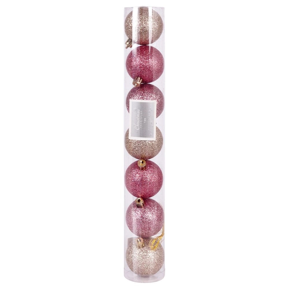 Varázslatos ünnepi hangulatot teremthet a 7 rózsaszín karácsonyi díszből álló készlettel a rózsaszín finom árnyalataiban, csillogó felülettel. Minden gömb 5 cm átmérőjű, és fém sapkával rendelkezik az egyszerű felakasztásért. A díszek minőségi műanyagból készülnek, melyek megjelenésükben az üveget idézik, ugyanakkor lényegesen ellenállóbbak és biztonságosabbak.