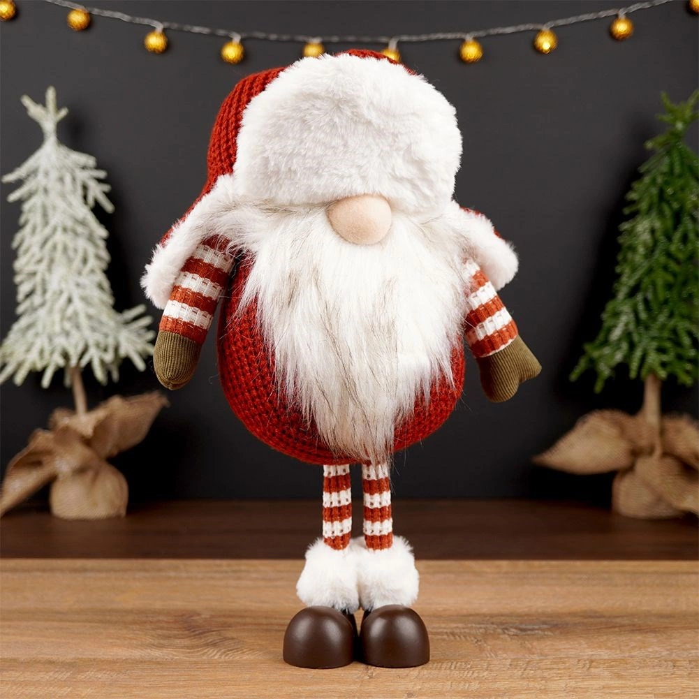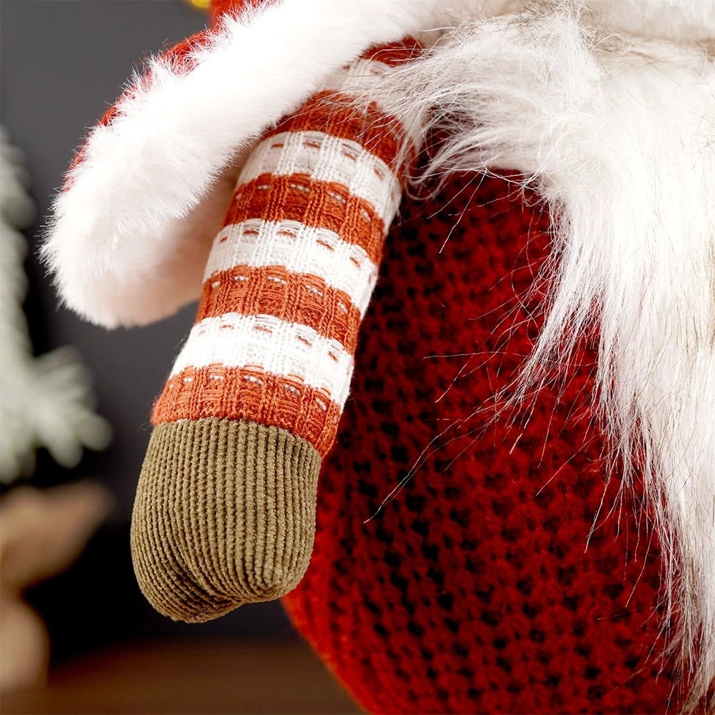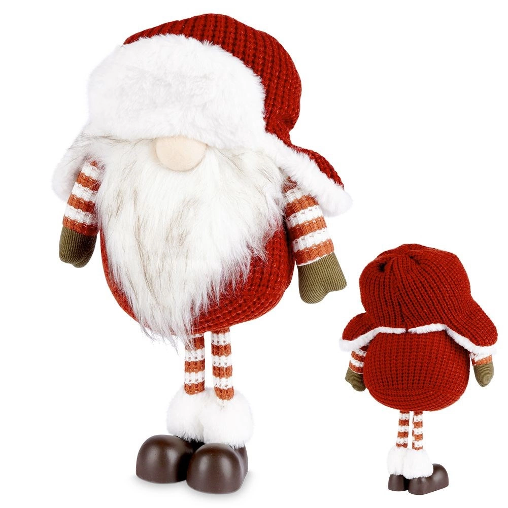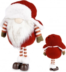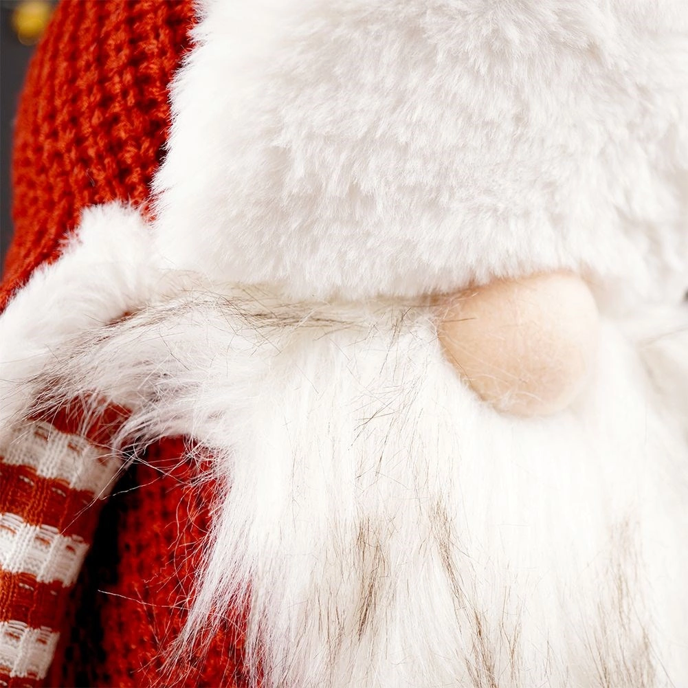 A piros kötött ruha, a szőrmés szegély és a dús fehér szakáll meleg, hagyományos karácsonyi hangulatot kölcsönöz a dekorációnak, amely bármelyik enteriőrbe illik.