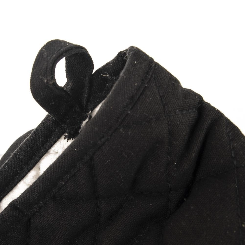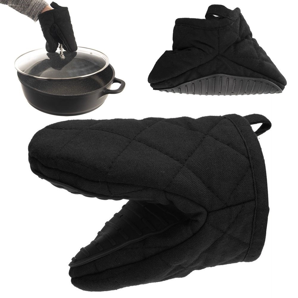 Ez a strapabíró, elegáns fekete színű konyhai kesztyű a puha pamutot csúszásmentes szilikonréteggel ötvözi a belső oldalon a biztos, biztonságos fogásért. Ideális mindennapi főzéshez és sütéshez, megóvja a tenyeret a forró tepsik, sütőtálak és edények kezelésekor.