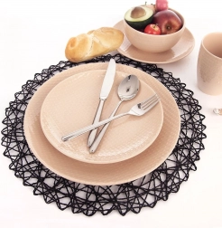 Elegáns asztaldekoráció kör alakú fekete papíralátét formájában, amely modern, letisztult megjelenést kölcsönöz a megterített asztalnak. A csipkét idéző struktúra nagyon dekoratív, és jól érvényesül tányérok, illetve üveg vagy kerámia kiegészítők alatt.