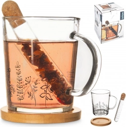 Stílusos, 400 ml-es üveg bögre üveg áztatóval és bambusz csészealjjal a tea és gyógynövényes főzetek kényelmes elkészítéséhez. A praktikus fülnek és az átgondolt, parafadugós szűrőnek köszönhetően az ital elkészítése egyszerű és tiszta. Az ital az üveg bögrében szépen érvényesül, így tálalásra is ideális. Minőségi üveg, fedeles áztató, bambusz csészealj, elegáns, növényi motívumos design.
