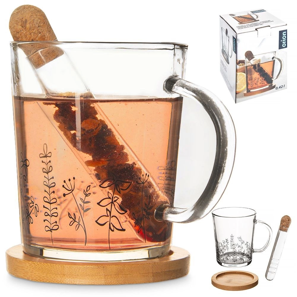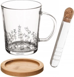 Élvezze kedvenc teáját vagy gyógynövényeit eleganciával. A 400 ml-es üveg bögrét üveg áztató egészíti ki parafadugós zárással és sima bambusz csészealjjal. Az áttetsző üveg finom növényi motívumokkal kiemeli az ital színeit, és a mindennapi ivást kis szertartássá varázsolja.