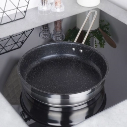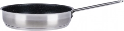 Masszív, 26 cm átmérőjű acél serpenyő gránit tapadásmentes bevonattal az egészséges, minimális zsiradékkal történő főzéshez. Többrétegű akutermikus talppal a gyors és egyenletes hőeloszlásért, karcálló, és alkalmas gáz-, elektromos, üvegkerámia, halogén és indukciós főzőlapokra is. Mosogatógépben mosható és sütőben is használható.