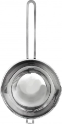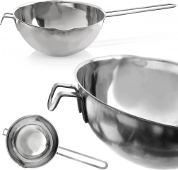Ez a vízfürdőhöz készült rozsdamentes acél tál precíz és kíméletes melegítést tesz lehetővé odaégés kockázata nélkül. Tökéletes választás házi cukrászoknak és a kézzel öntött gyertyák kedvelőinek is – ideális csokoládé, vaj és viasz olvasztásához. A praktikus, hosszú nyél biztonságos fogást ad, a akasztó pedig stabilan a fazék peremén tartja a tálat.