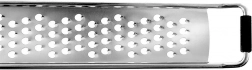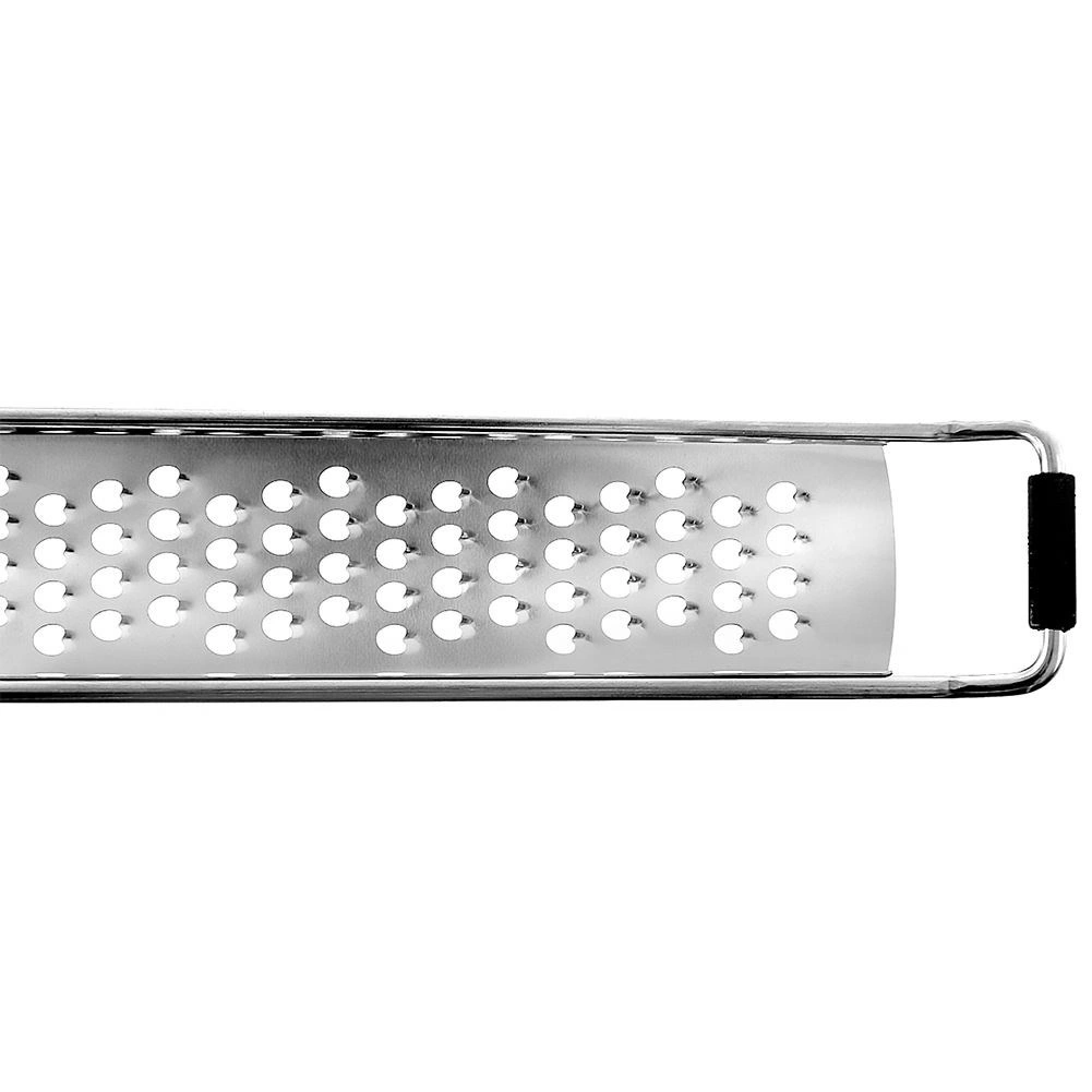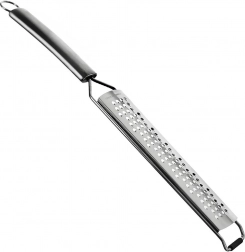 Praktikus, lapos rozsdamentes acél reszelő 38 cm hosszúsággal és 4 cm szélességgel a gyors és egyenletes reszeléshez. Az éles perforációknak köszönhetően könnyedén lereszelheti a zöldséget, kemény sajtokat, fokhagymát, dióféléket és a citrusok héját is. Hosszú nyele van akasztófüllel, csúszásgátló véggel a biztonságos edényen történő használathoz, valamint védőtokkal a biztonságos tároláshoz. Mosogatógépben mosható.