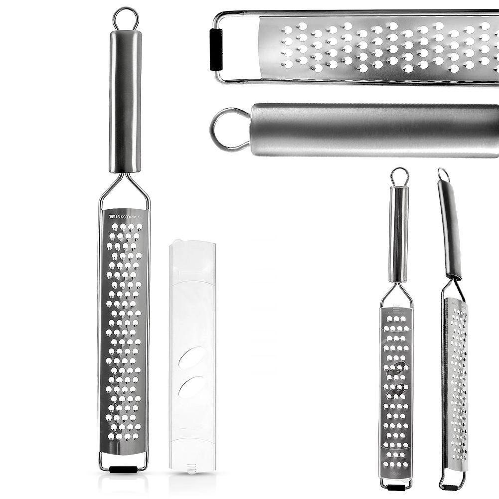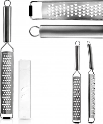 Az éles perforáció finom és egyenletes eredményt biztosít zöldség, kemény sajt, csokoládé vagy fűszerek – például gyömbér, fahéj vagy szerecsendió – reszelésekor. A praktikus védőtok óvja az élt és a fiókban lévő többi eszközt, megkönnyítve a tárolást.