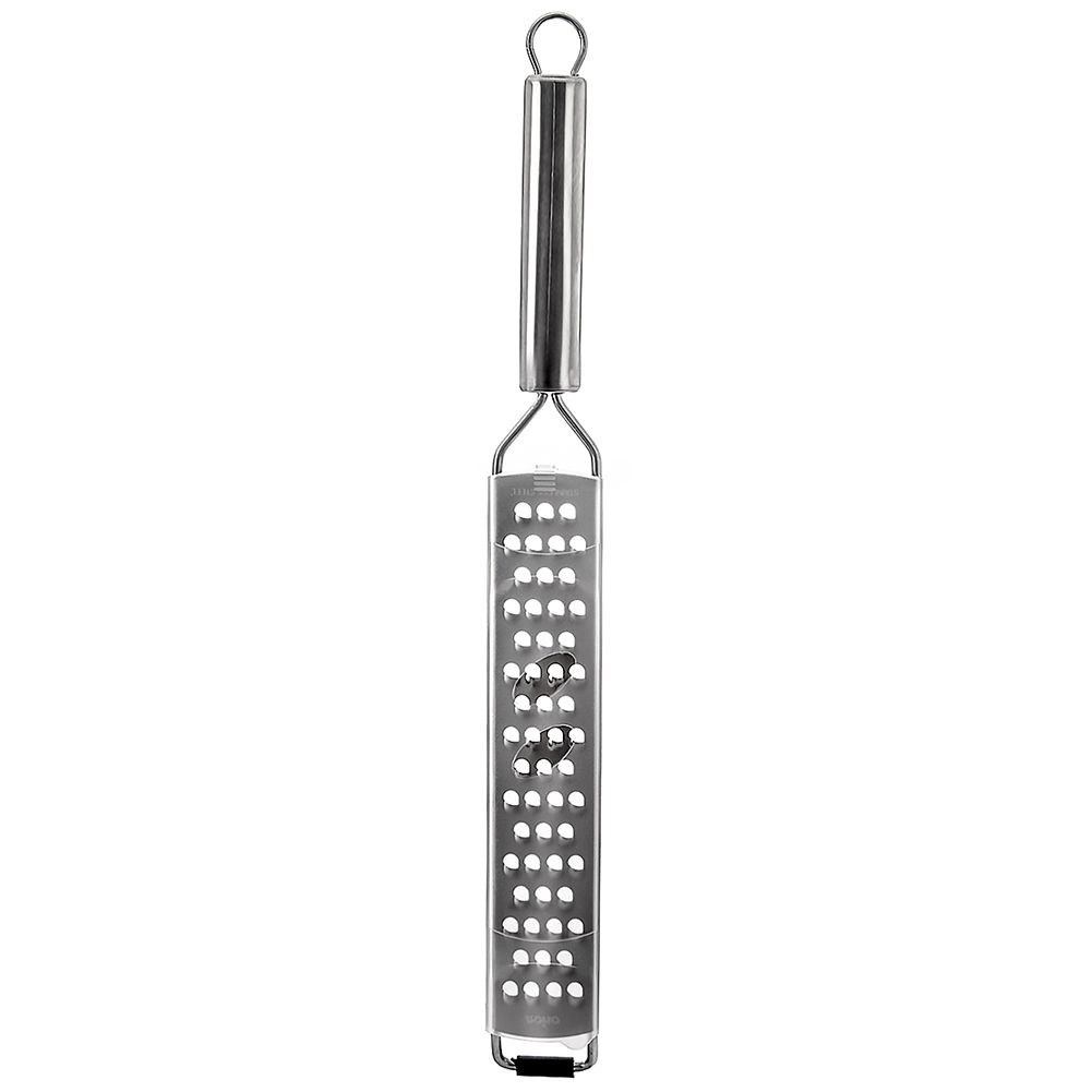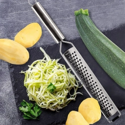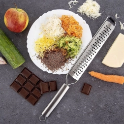 Sokoldalú konyhai reszelő, minőségi rozsdamentes acélból, ideális a mindennapi ételkészítéshez. A hosszú, ergonomikus nyél kényelmes fogást biztosít, így pontos és gyors reszelést tesz lehetővé erőfeszítés nélkül. A csúszásgátló vég védi a lábasokat és serpenyőket a karcolástól, ezért közvetlenül az edénybe is reszelhet.