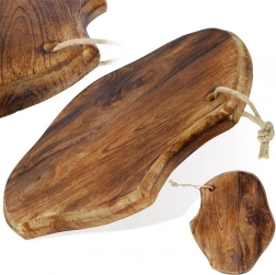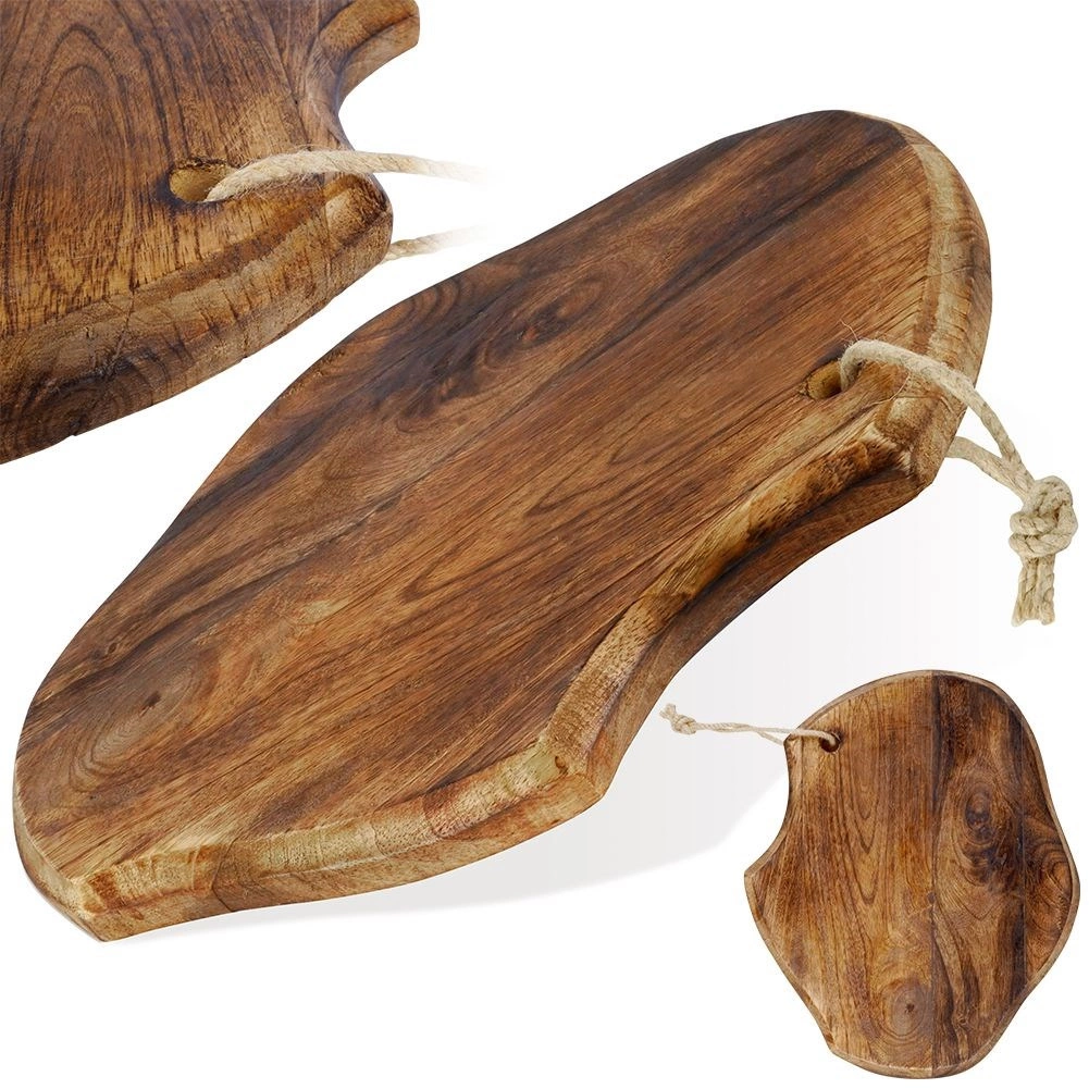 Stílusos mangófadeszka mindennapi szeleteléshez és látványos tálaláshoz. Természetesen szabálytalan formával, masszív, 2 cm vastag kivitelben, praktikus akasztólyukkal és zsinórral, valamint nedvességgel és deformációval szembeni ellenállással. Ideális sajtok és felvágottak tálalásához, és dekoratív kiegészítője a konyhának is.