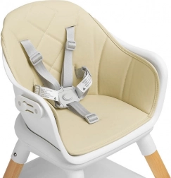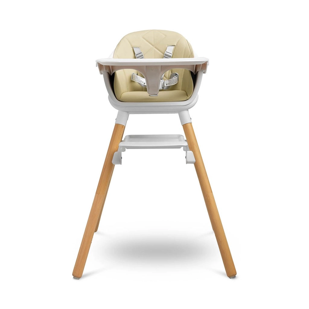 A formázott tálca levehető felső résszel minimálisra csökkenti az etetés közbeni rendetlenséget és megkönnyíti a tisztítást. Az ökológikus bőrből készült kárpit és a műanyag ülőrész egyszerűen letörölhető. A maximális biztonságról négy tömör fa láb csúszásgátló végekkel és egy állítható ötpontos biztonsági öv gondoskodik. A termék megfelel az EN 14988:2017+A1:2020 szabványnak.