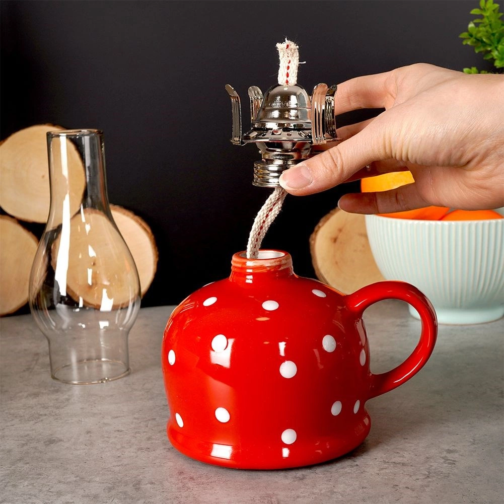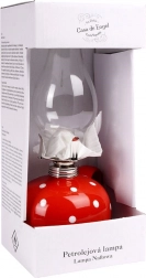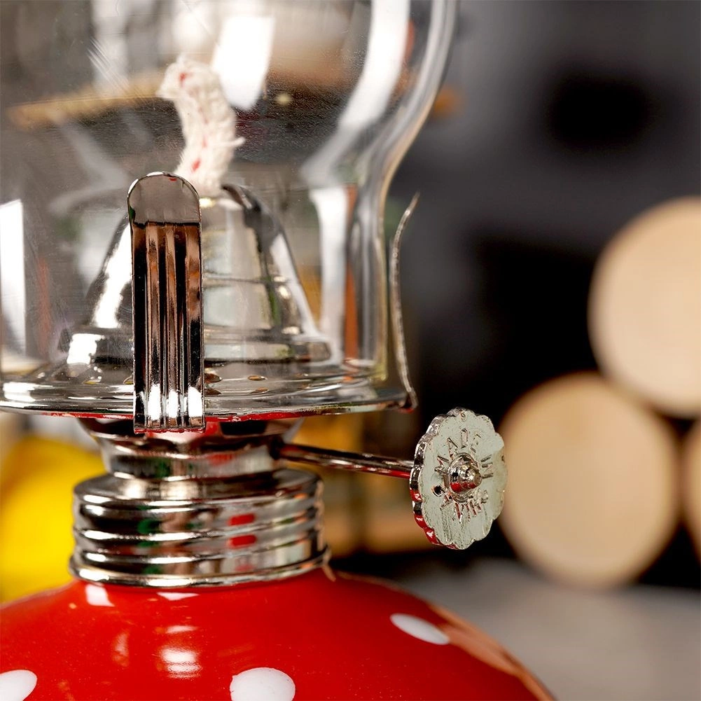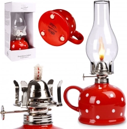 A hagyományos petróleum-/naftalámpa elegáns, retro stílusban ötvözi a dekoratív megjelenést és a megbízható, áram nélküli világítást. Az üvegkémény hatékonyan védi a lángot és bőséges fényt enged át, a piros, fehér pöttyös kerámia tartály pedig karakteres dizájnelem.