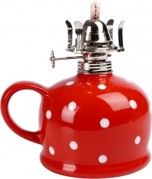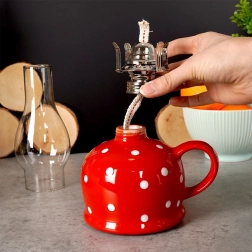 Stílusos, retro dizájnú kerámia petróleumlámpa 530 ml űrtartalommal és 28,5 cm magassággal, amely kellemes hangulatfényt ad otthon, nyaralóban vagy áramszünet esetén. Strapabíró üvegkéménnyel, fém égőfejjel és állítható kanóccal, valamint praktikus füllel a hordozáshoz. A piros test fehér pöttyökkel vintage bájt és romantikus hangulatot kölcsönöz a térnek.