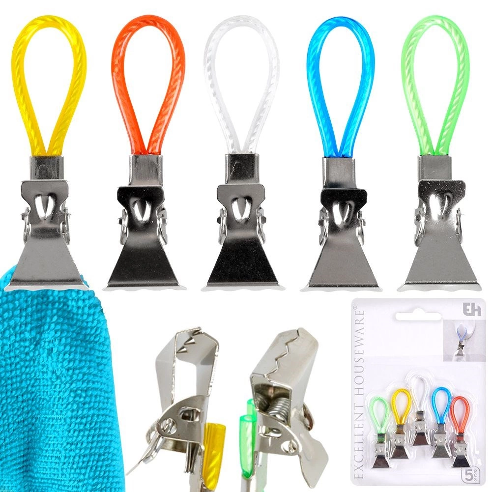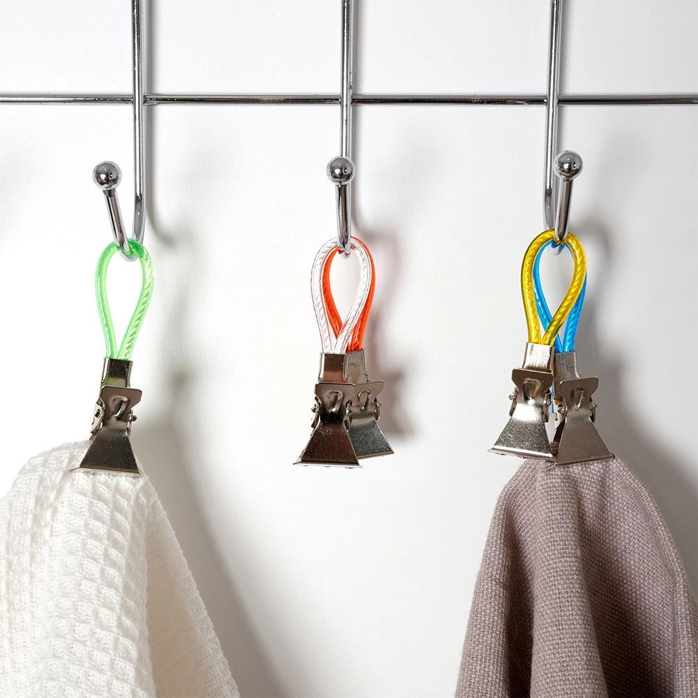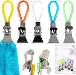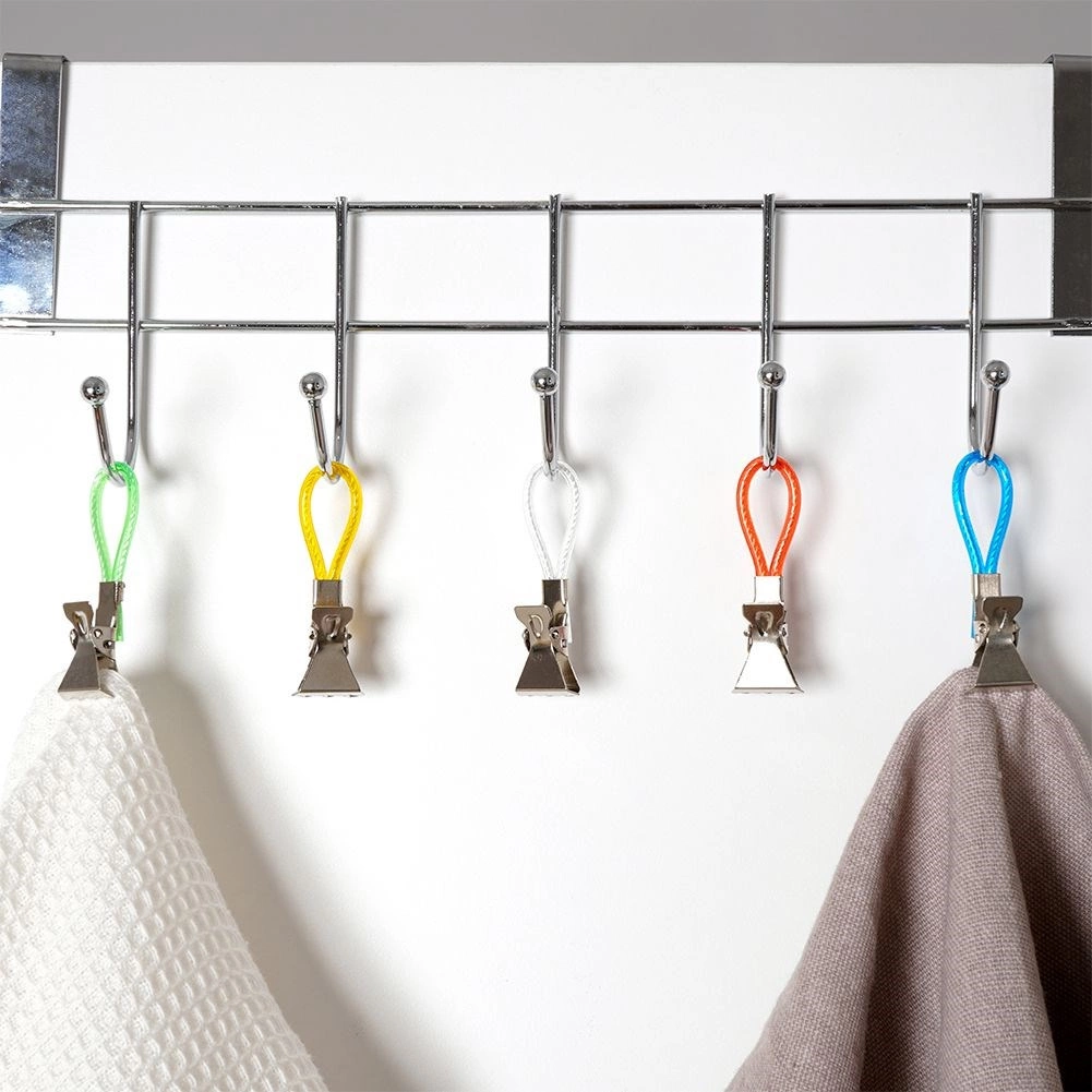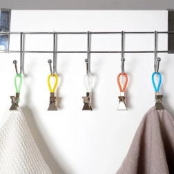 Fedezze fel az egyszerű módját annak, hogy a törölközők és konyharuhák mindig kéznél legyenek és rendezetten lógjanak. A fém klipszek színes hurkokkal gyors felakasztást tesznek lehetővé kampóra, rúdra vagy akasztóra, és a fogazott pofáknak köszönhetően a simább szöveteken is stabilan tartanak. A különböző színű hurkok megkönnyítik az egyes családtagok törölközőinek megkülönböztetését.