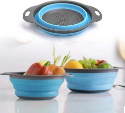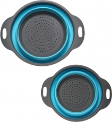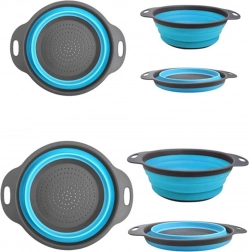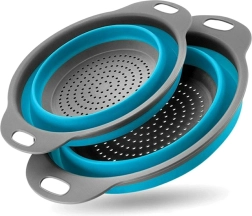 Ez a készlet két rendkívül praktikus, kör alakú szilikon szűrőt tartalmaz, melyek ideálisak a helytakarékos megoldásra. **Összecsukható kivitelének** köszönhetően, a szűrők magassága csupán 3 cm, ami megkönnyíti a szállítást vagy a szekrényben való tárolást. Kiválóan használhatóak kisebb konyhákban vagy turisztikai célokra. Kibontva 8 cm magasságig is elérhetők, ami kényelmes gyümölcsök, zöldségek vagy tészta leöblítésére és lecsöpögtetésére.